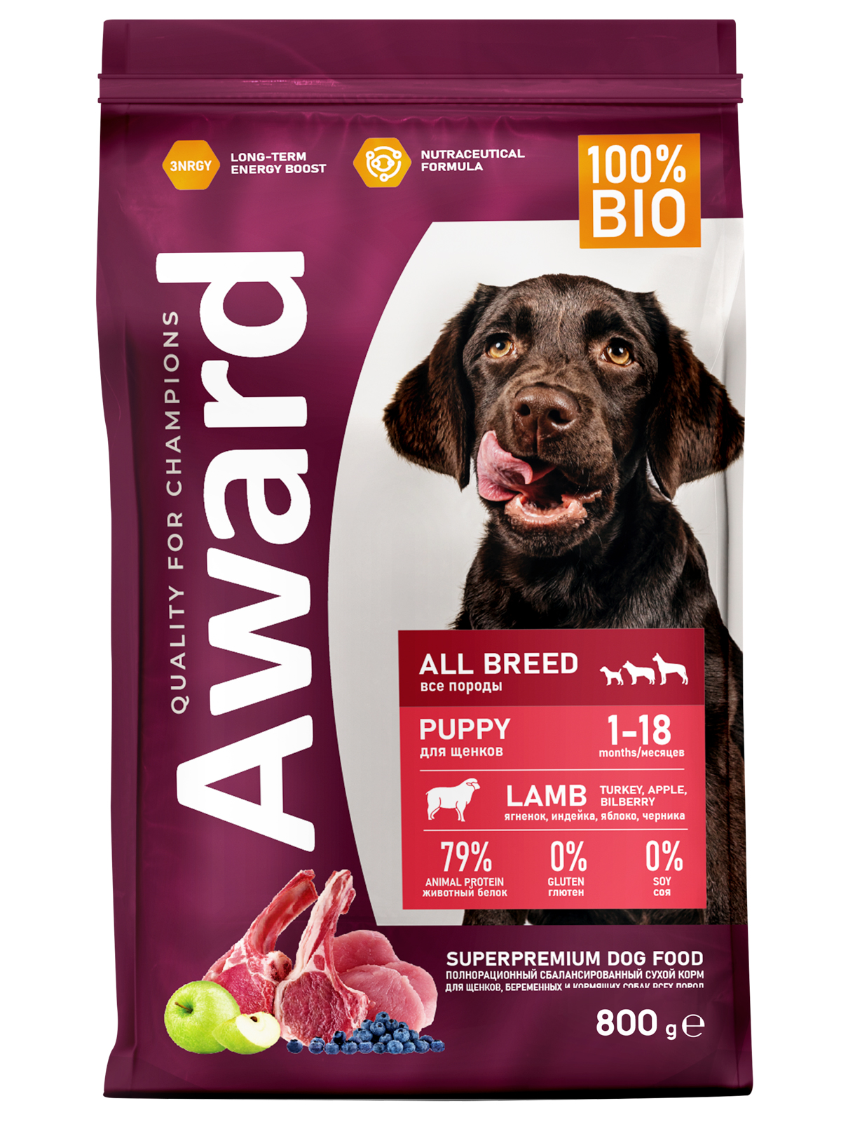 Сухой корм AWARD для щенков от 1 месяца, беременных и кормящих сук всех пород с ягненком и индейкой с добавлением яблока и черники.
