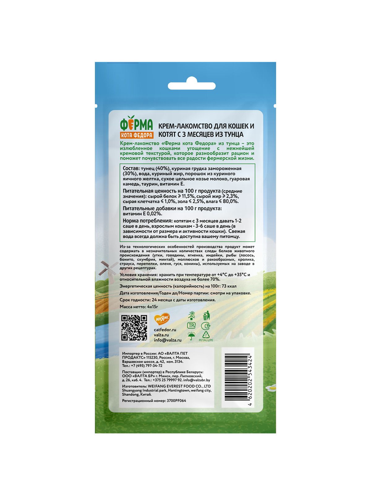 Крем-лакомство "Ферма кота Федора" из тунца - это излюбленное кошками угощение с нежнейшей кремовой текстурой, которое разнообразит рацион и поможет почувствовать все радости фермерской жизни. Подается как порционное угощение, или добавляется в виде аппетитного соуса к основному рациону для обогащения вкуса привычных блюд. Изготовлено по новейшей японской технологии и соответствует мировым стандартам качества. Упаковка включает в себя 4 порционных саше весом 15 г.
