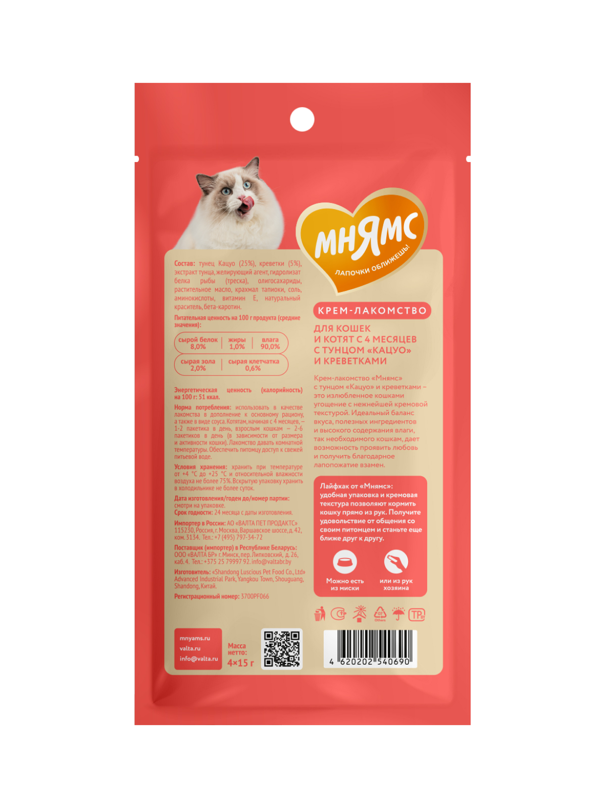 Крем-лакомство «Мнямс» с тунцом Кацуо и креветками – это излюбленное кошками угощение с нежнейшей кремовой текстурой. Идеальный баланс вкуса, полезных ингредиентов и высокого содержания влаги, так необходимого кошкам, дает возможность проявить любовь и получить благодарное лапопожатие взамен.