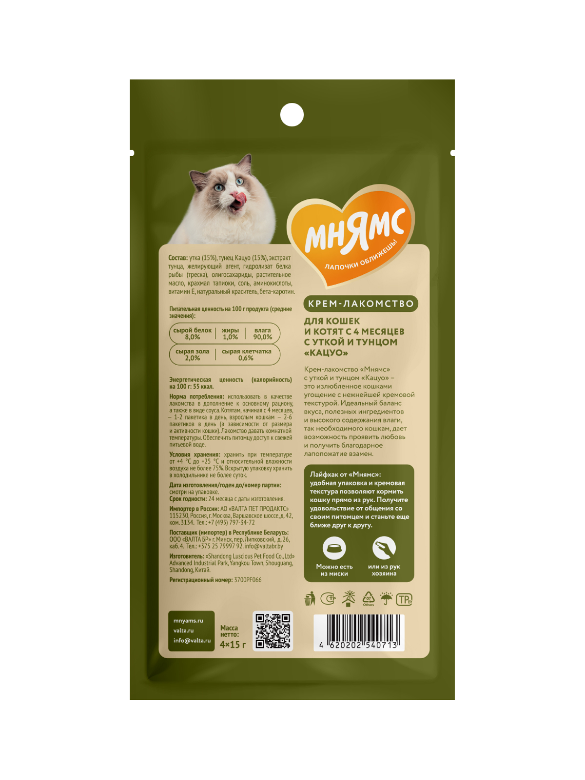 Крем-лакомство «Мнямс» с уткой и тунцом Кацуо – это излюбленное кошками угощение с нежнейшей кремовой текстурой. Идеальный баланс вкуса, полезных ингредиентов и высокого содержания влаги, так необходимого кошкам, дает возможность проявить любовь и получить благодарное лапопожатие взамен.