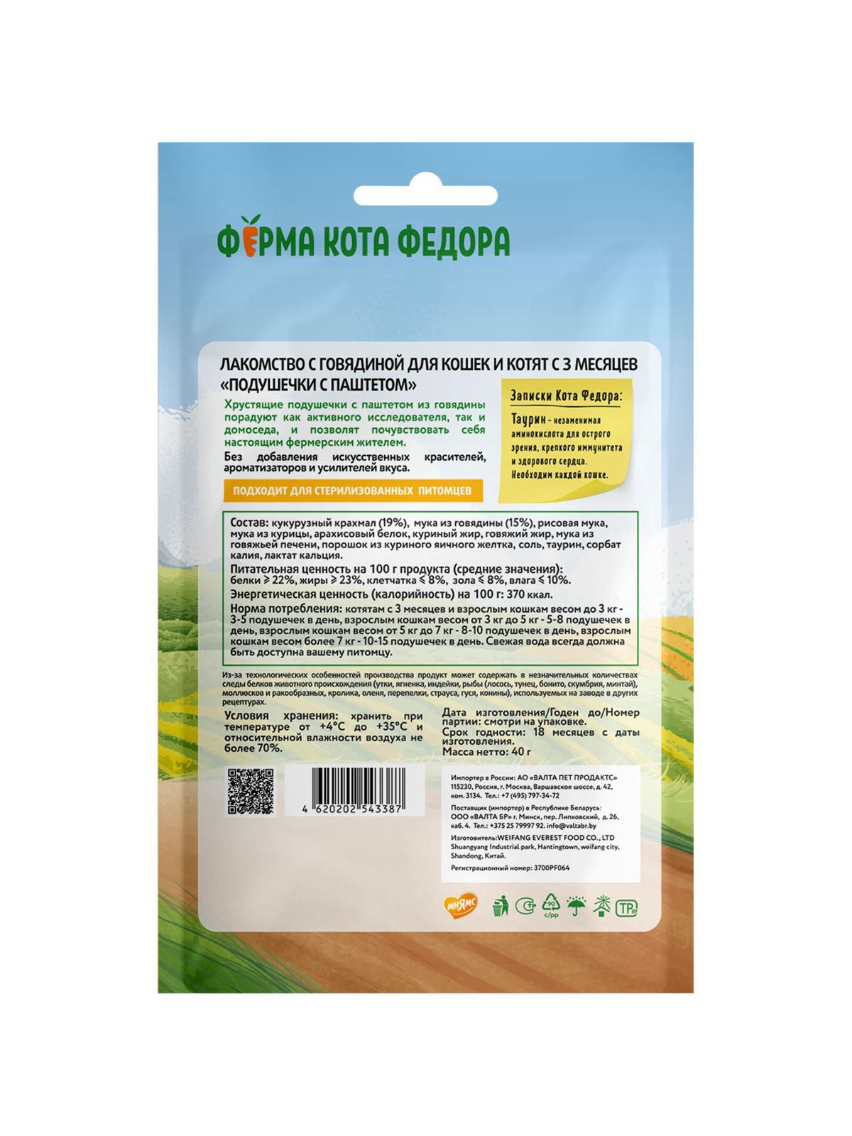Хрустящие подушечки "Ферма кота Федора" с паштетом из говядины порадуют как активного исследователя, так и домоседа, и позволят почувствовать себя настоящим фермерским жителем. Натуральные ингредиенты с оптимальным количеством витаминов и минералов точно придутся по вкусу вашему питомцу. Без добавления исскуственных красителей, ароматизаторов и усилителей вкуса.