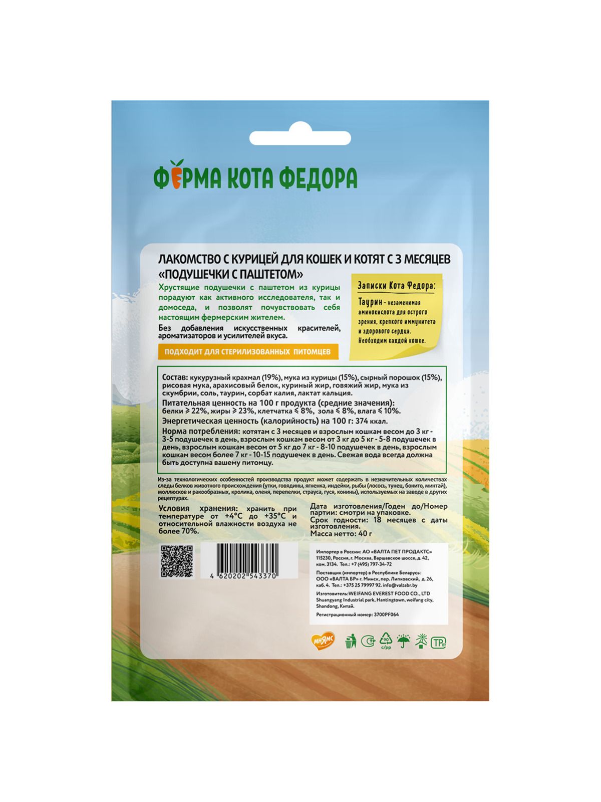 Хрустящие подушечки "Ферма кота Федора" с паштетом из курицы порадуют как активного исследователя, так и домоседа, и позволят почувствовать себя настоящим фермерским жителем. Натуральные ингредиенты с оптимальным количеством витаминов и минералов точно придутся по вкусу вашему питомцу. Без добавления исскуственных красителей, ароматизаторов и усилителей вкуса.