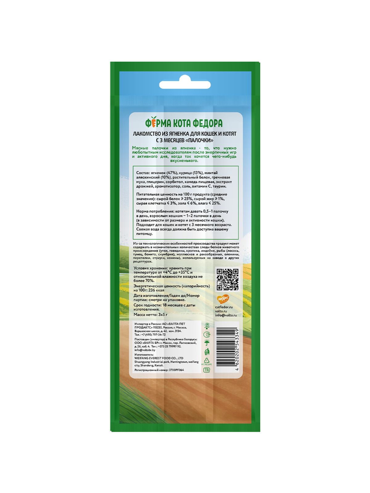 Лакомые палочки "Ферма кота Федора" из ягненка - то, что нужно любопытным исследователям после энергичных игр ии активного дня, когда так хочется чего-нибудь вкусненького. Натуральные ингредиенты с оптимальным количеством витаминов и минералов точно придутся по вкусу вашему питомцу. Упаковка включает в себя 3 палочки весом 5 г.