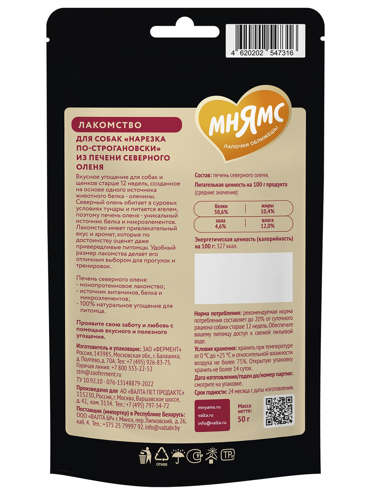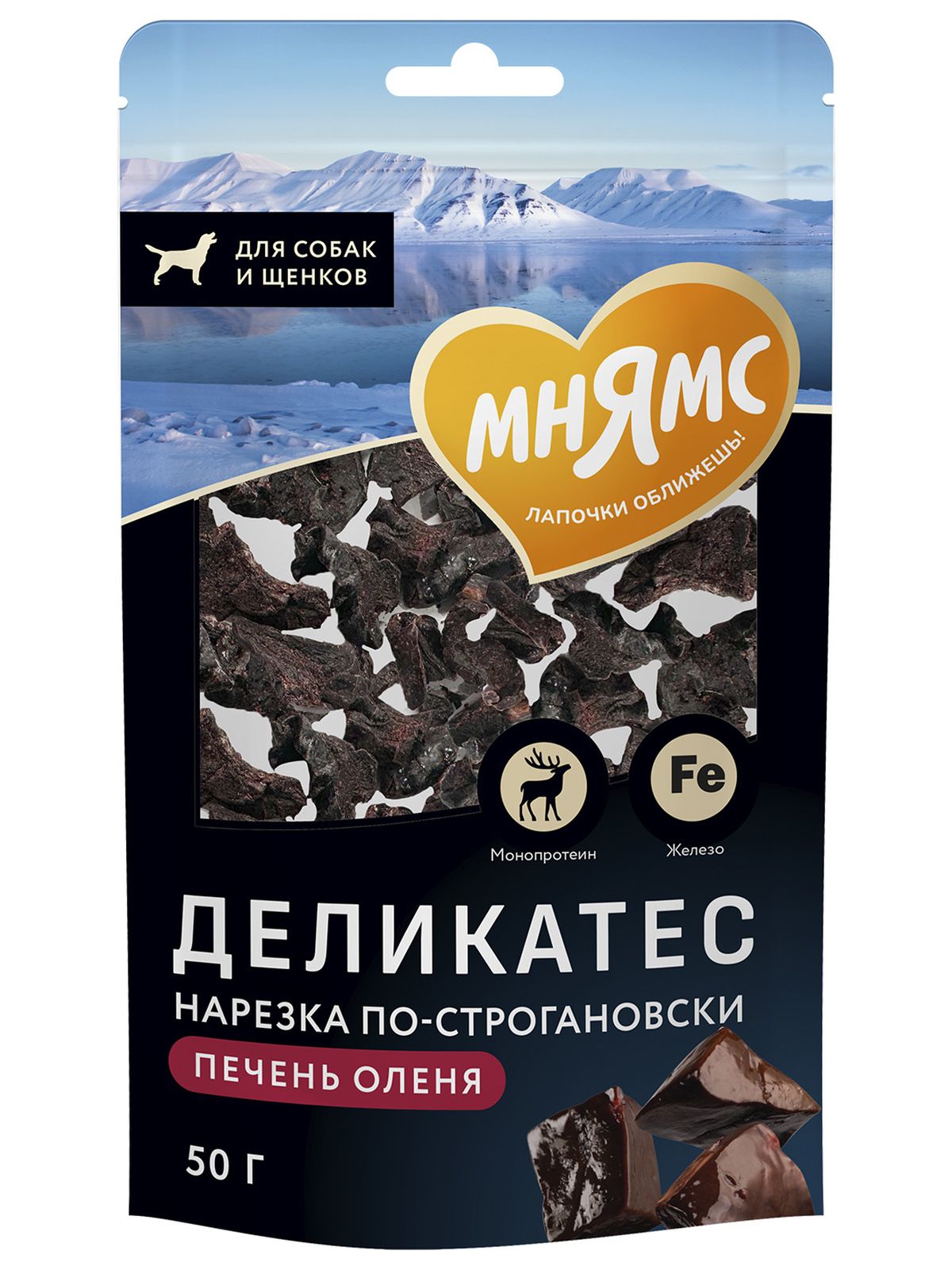 Лакомство Мнямс Деликатес «Нарезка по-строгановски» из печени северного оленя для собак 50 г.