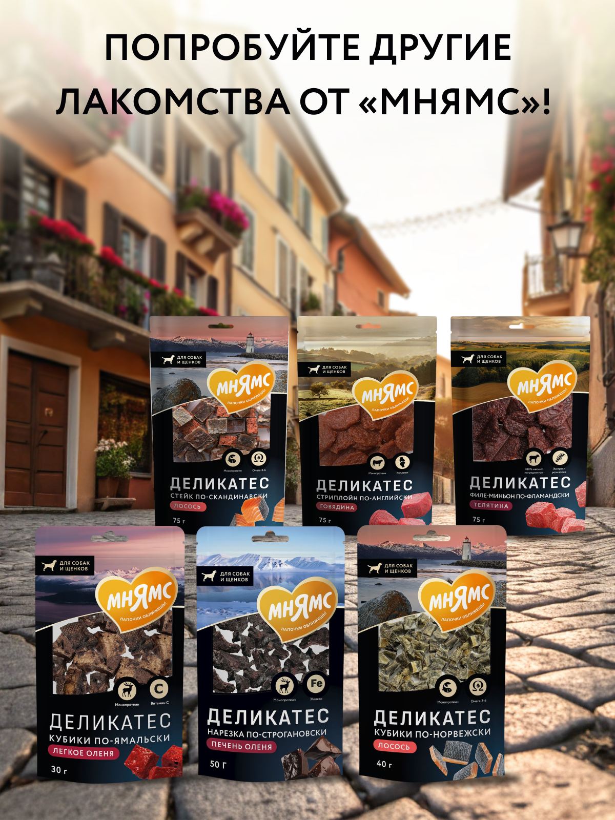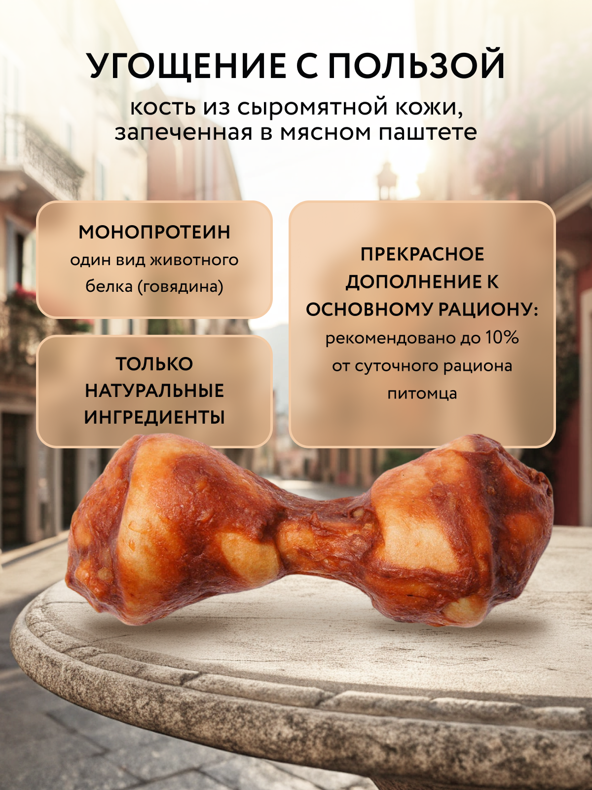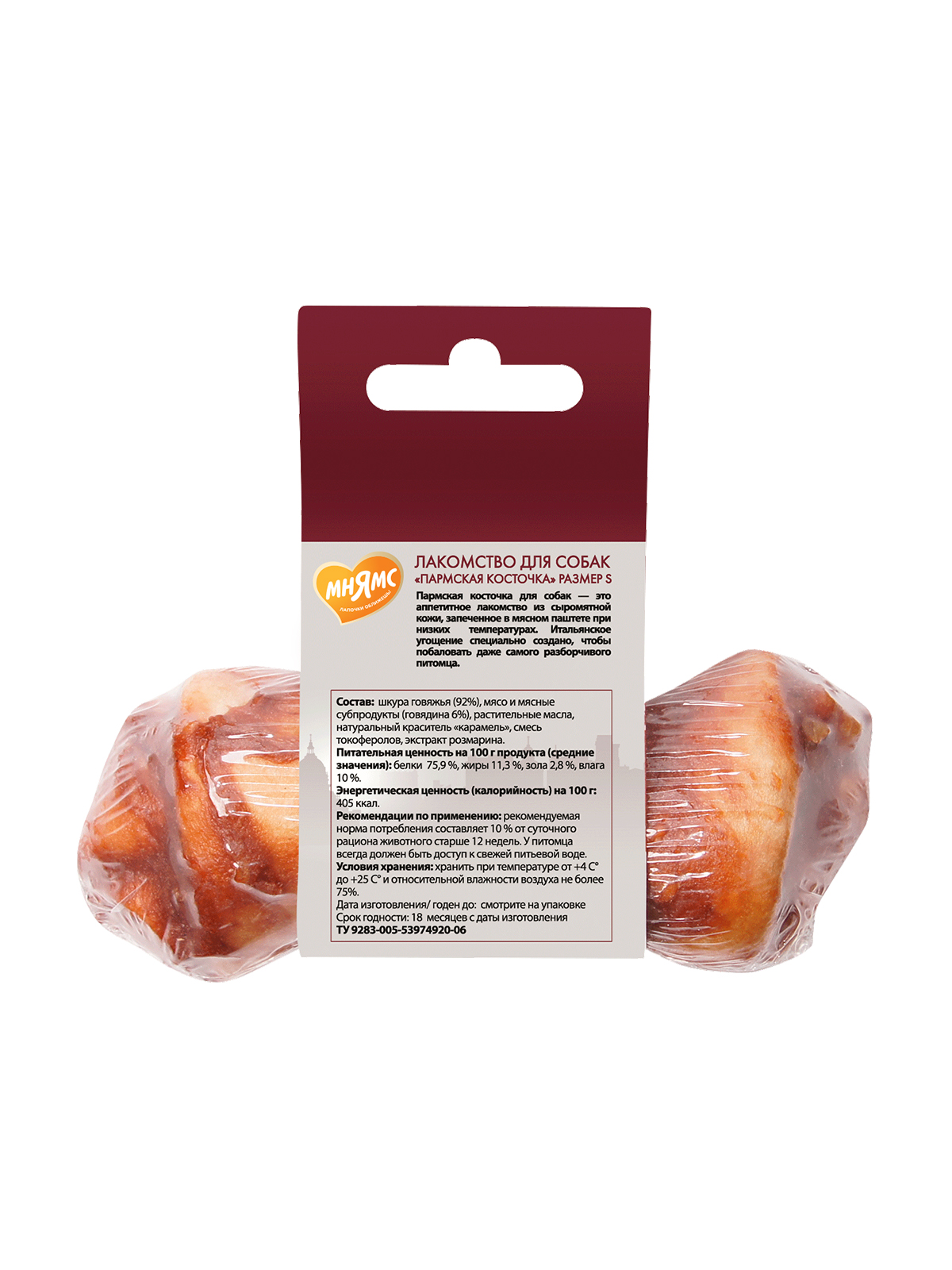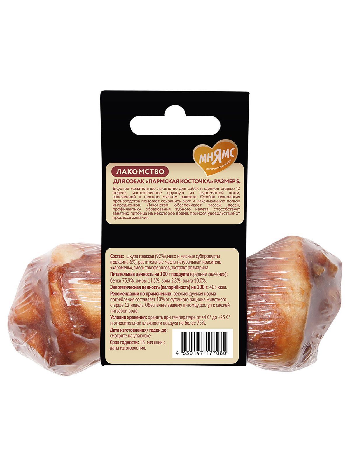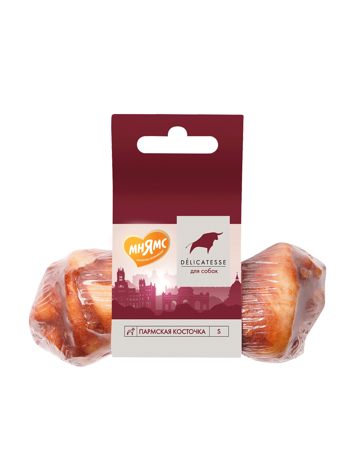 Лакомство Мнямс Деликатес Пармская косточка для собак размер S 35 г. Пармская косточка для собак — это аппетитное лакомство из сыромятной кожи, запеченное в мясном паштете при низких температурах Итальянское угощение специально создано, чтобы побаловать даже самого разборчивого в деликатесах питомца.