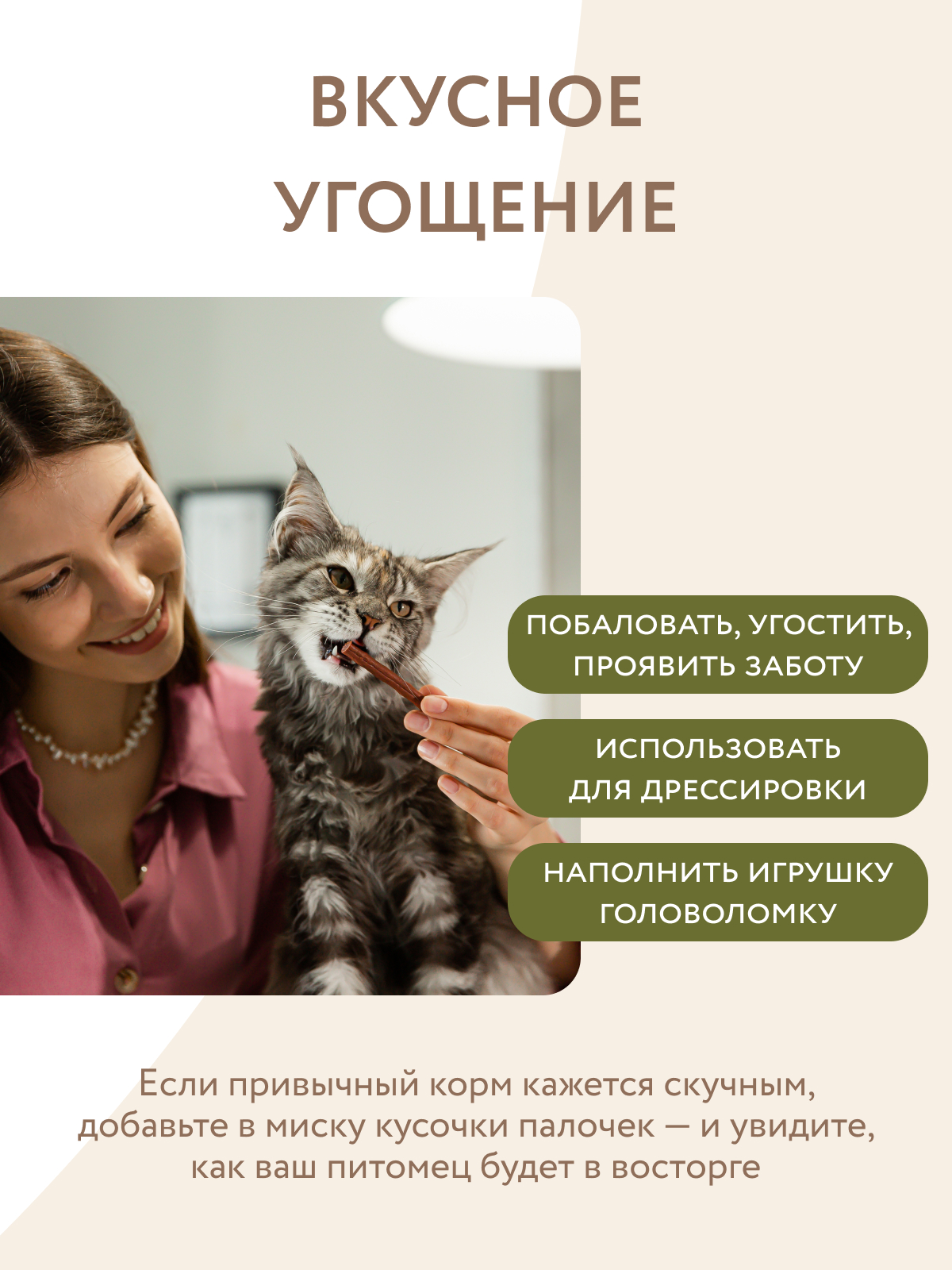 Лакомые палочки можно давать из рук, ломать и использовать для дрессировки, наполнять ими интерактивные игрушки или подмешивать в корм для улучшения вкусовой привлекательности.
