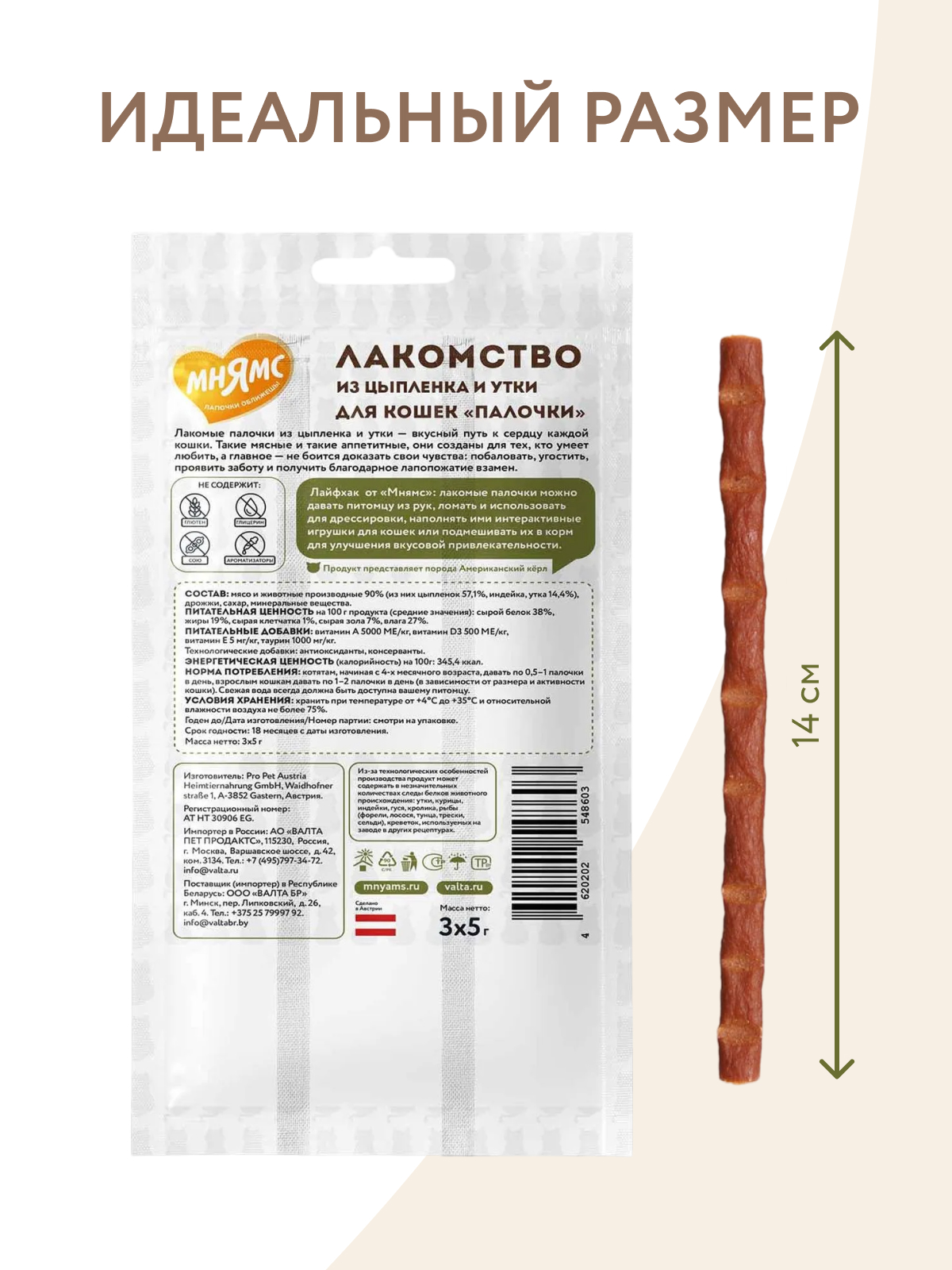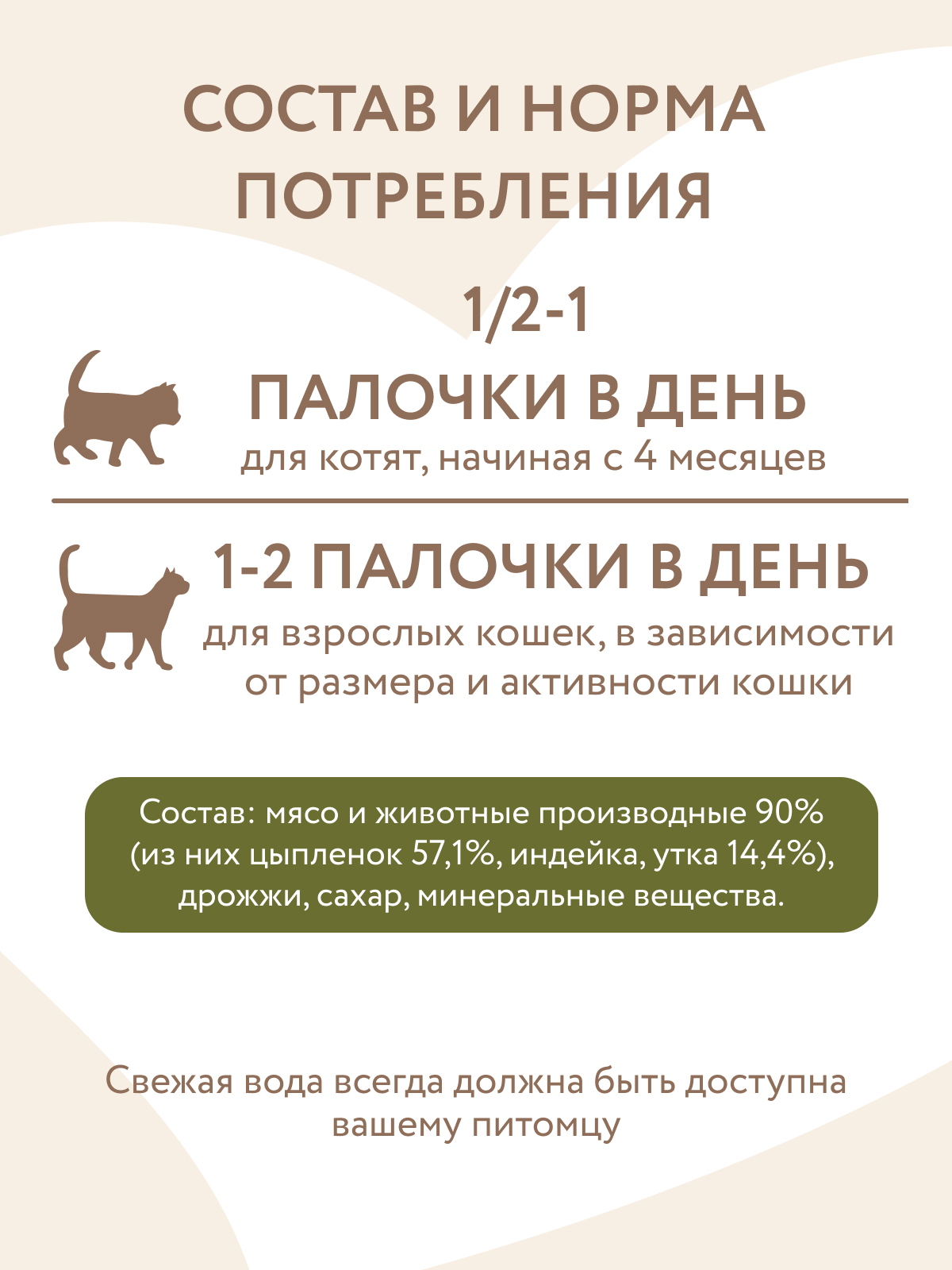 Норма потребления: котятам, начиная с 4-х месячного возраста, давать по 0,5–1 палочки в день, взрослым кошкам давать по 1–2 палочки в день (в зависимости от размера и активности кошки). Свежая вода всегда должна быть доступна вашему питомцу.