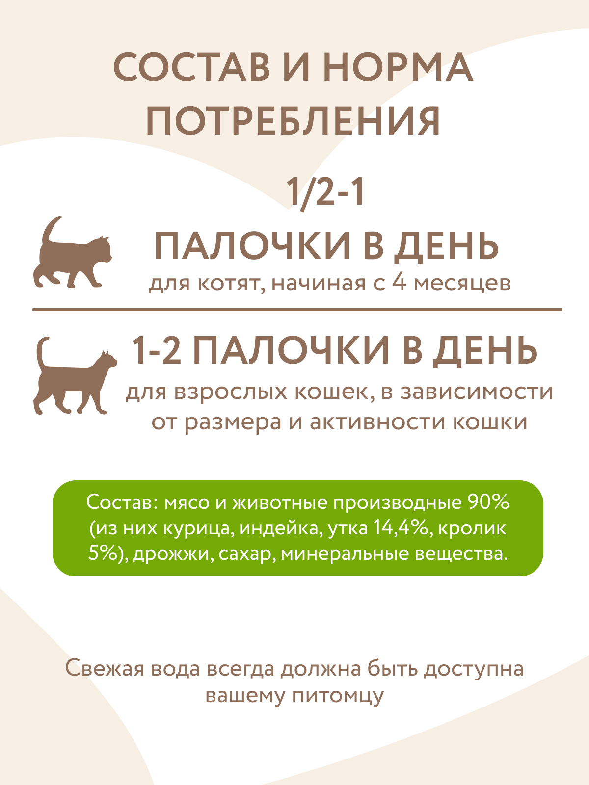 Норма потребления: котятам, начиная с 4-х месячного возраста, давать по 0,5–1 палочки в день, взрослым кошкам давать по 1–2 палочки в день (в зависимости от размера и активности кошки). Свежая вода всегда должна быть доступна вашему питомцу.