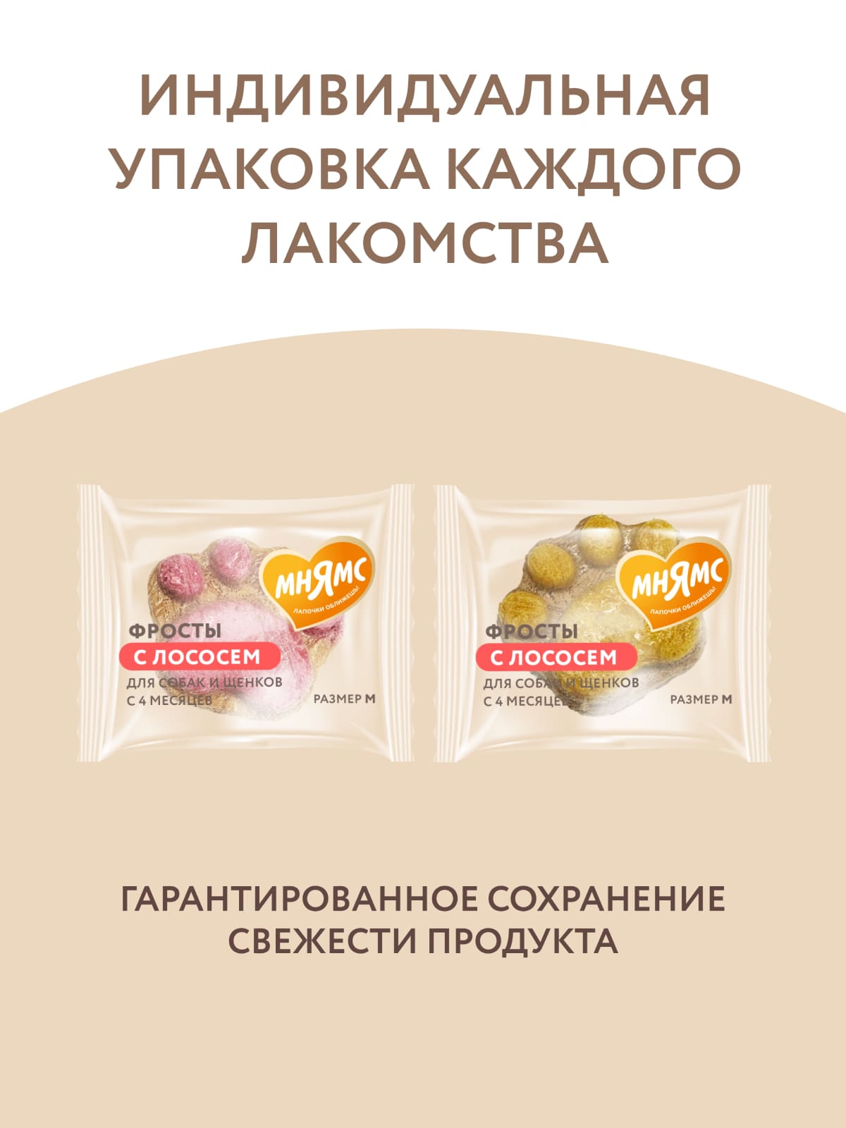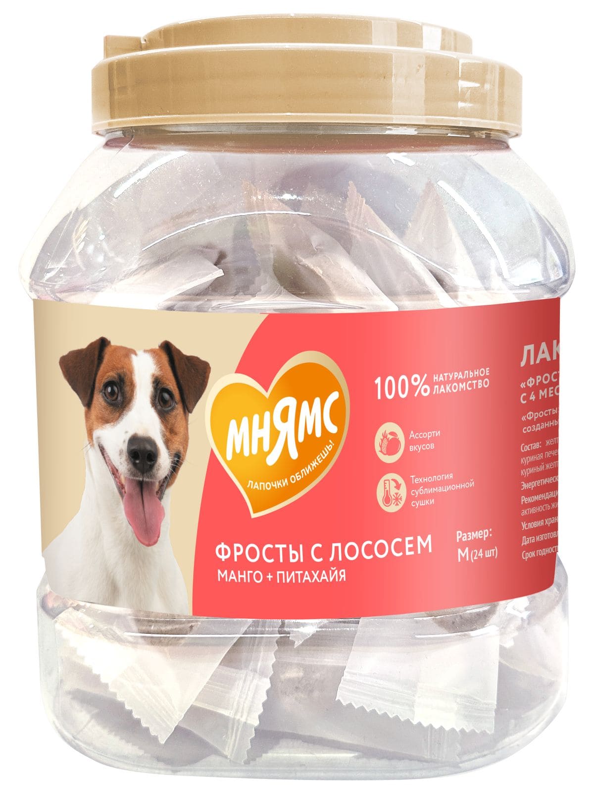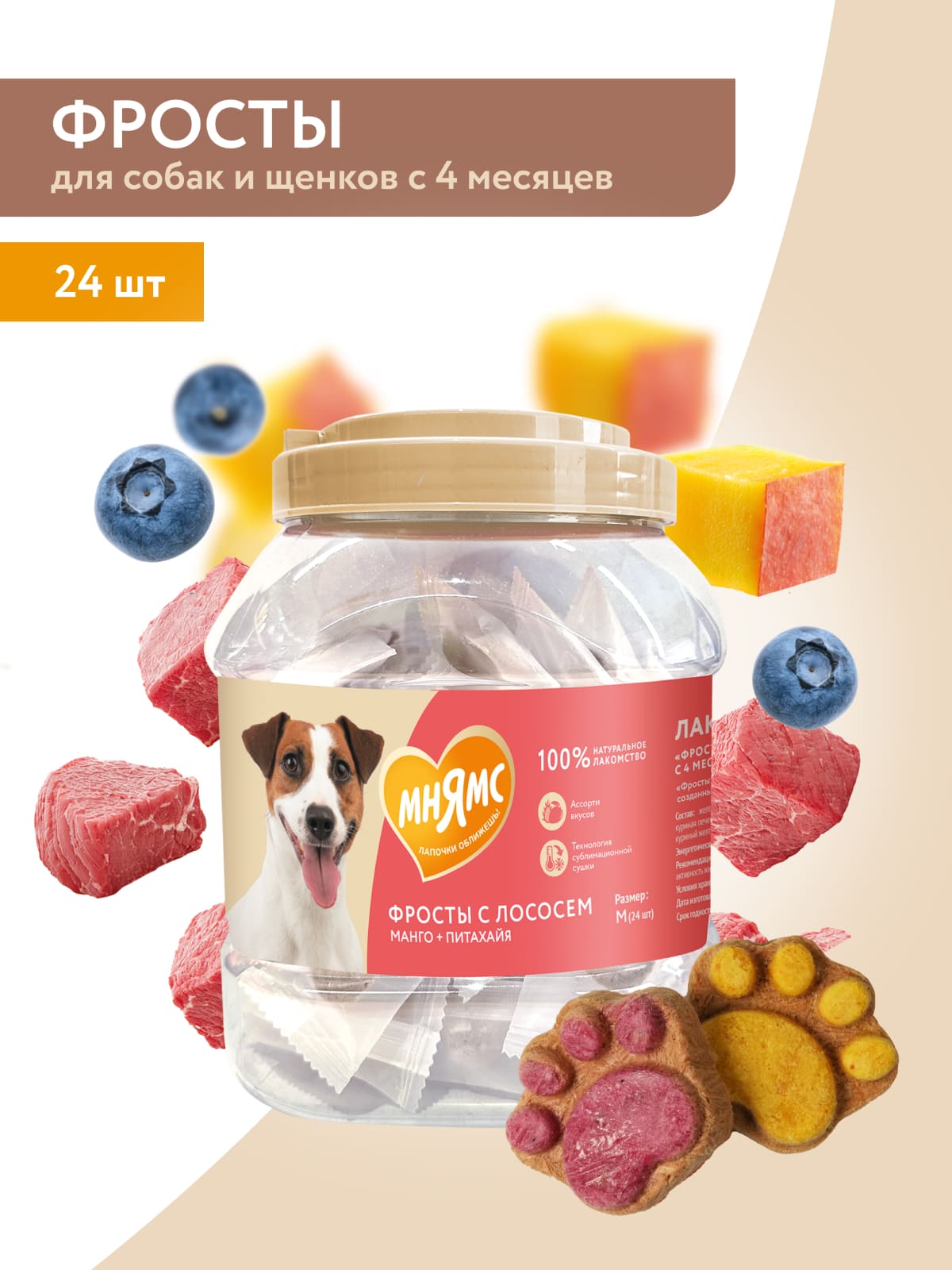 "Мнямс" Лакомство "Фросты" с лососем для собак и щенков с 4 месяцев - это сублимированные беззерновые лакомства с высоким содержанием животного белка (куриная грудка 55%, лосось 23%), созданные при помощи прогрессивной технологии сушки, которая сохраняет натуральный вкус мяса и питательные свойства ингредиентов. Манго и питахайя в составе являются источниками витаминов группы В, необходимых для укрепления иммунитета питомца.