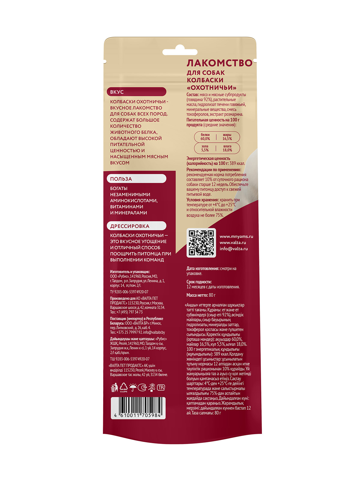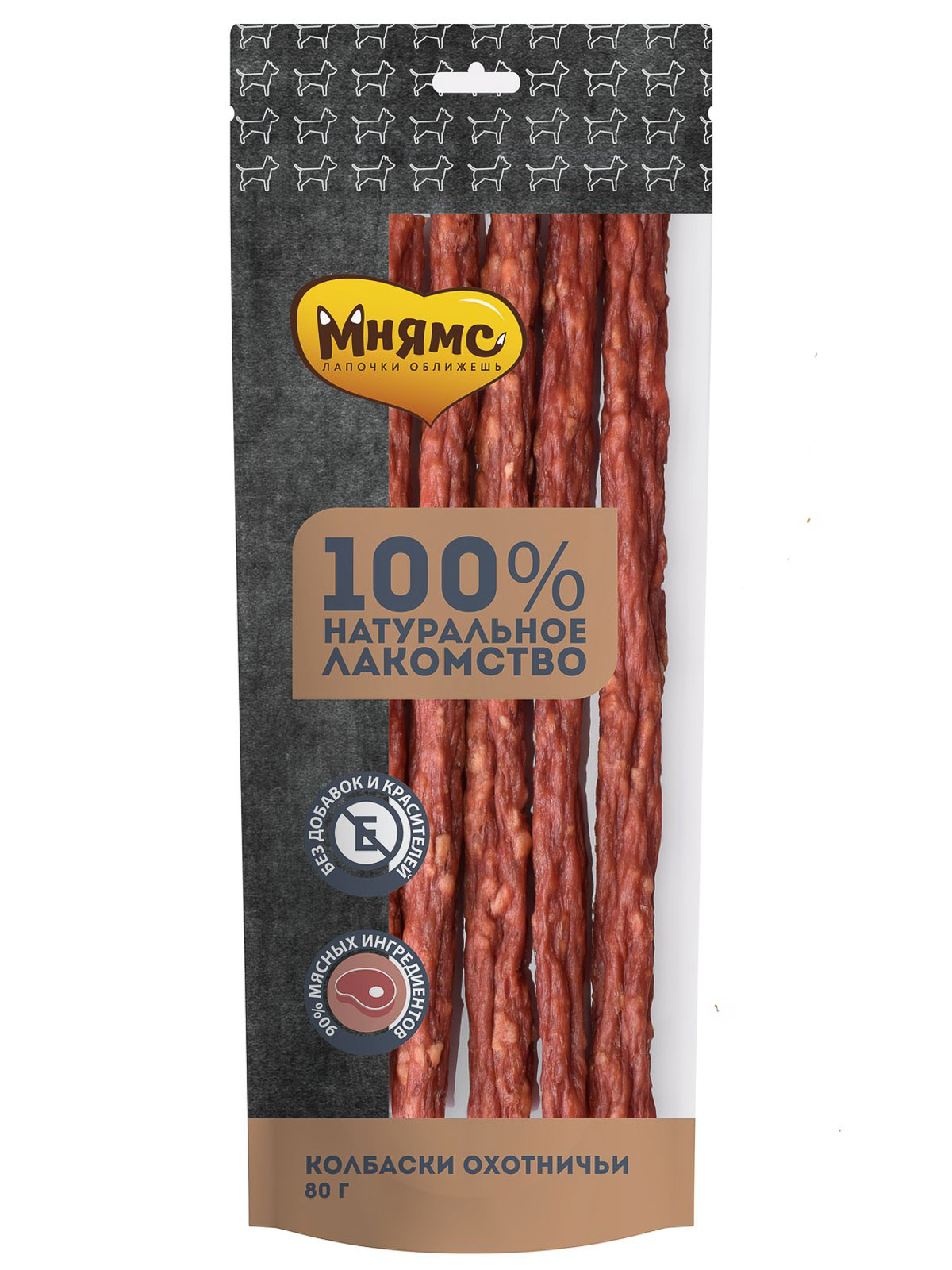 Лакомство Мнямс На каждый день для собак Колбаски охотничьи - охотничьи колбаски содержат высокое количество белка. Богаты незаменимыми аминокислотами, витаминами и минералами. Обладают высокой питательной ценностью и насыщенным мясным вкусом.