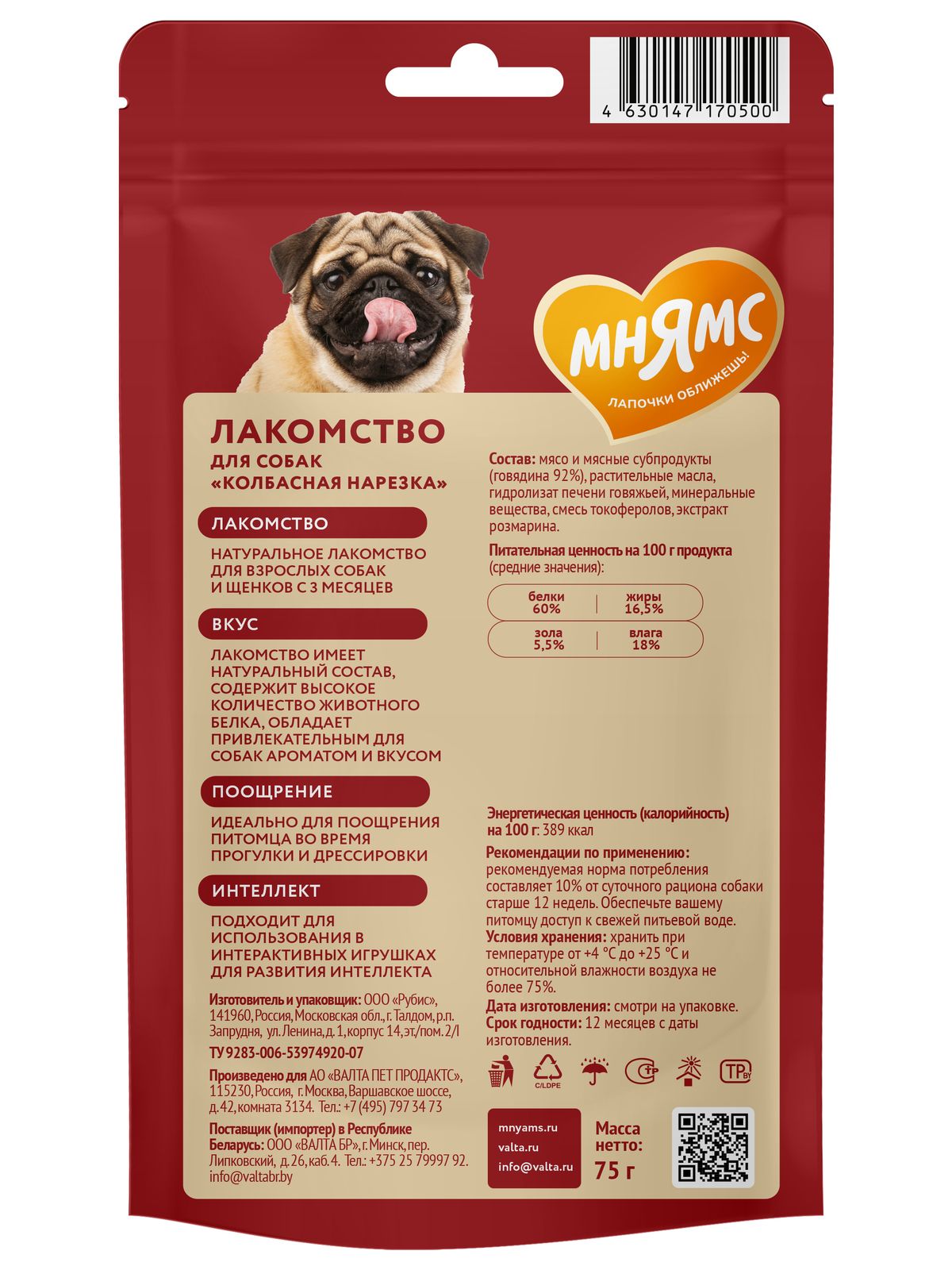Мнямс лакомство для собак Колбасная нарезка - вкусное и полезное лакомство для собак и щенков старше 3-х месяцев с высоким содержанием белка, незаменимыми аминокислотами, витаминами и минералами. Обладают высокой вкусовой привлекательностью, благотворно влияют на нервную и сосудистую системы. Идеально подходят в качестве ежедневного угощения и поощрения во время тренировок.