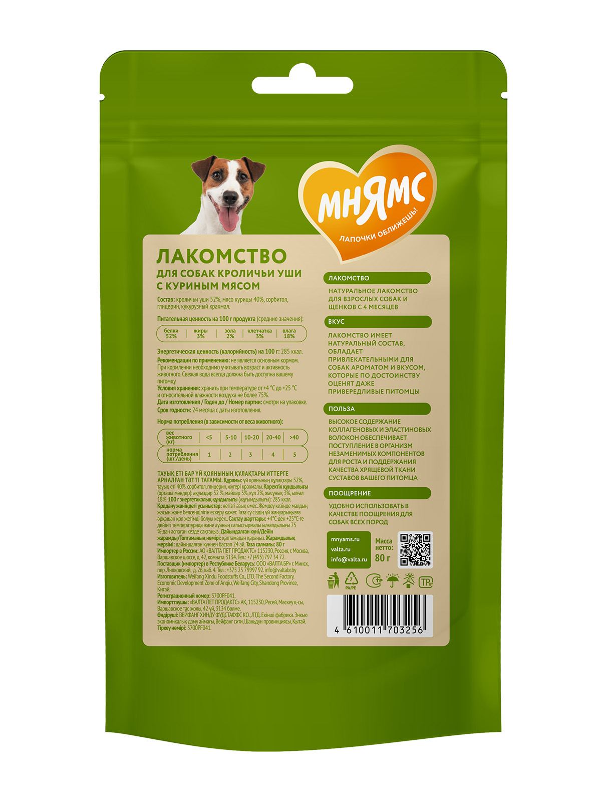 Состав: кроличьи уши 52%, курица 40%, сорбитол, глицерин, кукурузный крахмал.