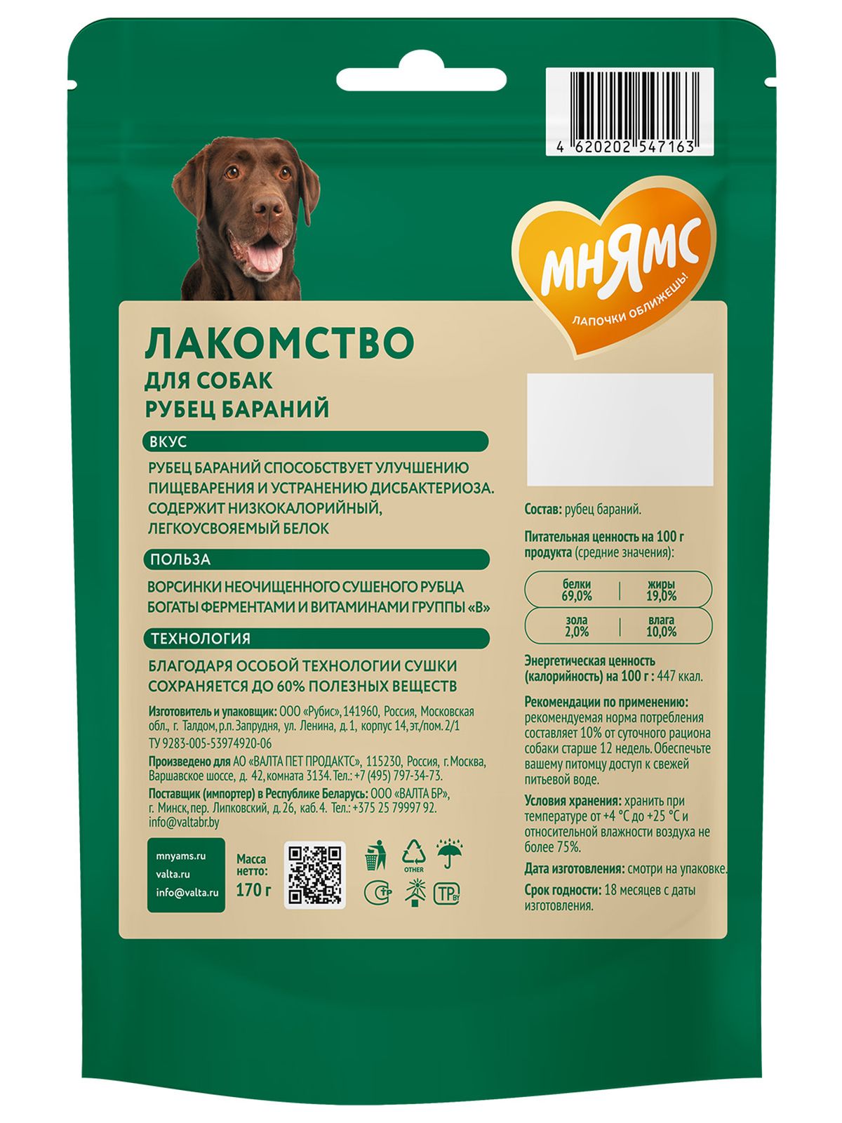Рубец бараний способствует улучшению пищеварения и устранению дисбактериоза. Ворсинки неочищенного сушёного рубца богаты ферментами и витаминами группы «В». Содержит низкокалорийный, легкоусвояемый белок. Благодаря особой технологии сушки сохраняется до 60% процентов полезных веществ.