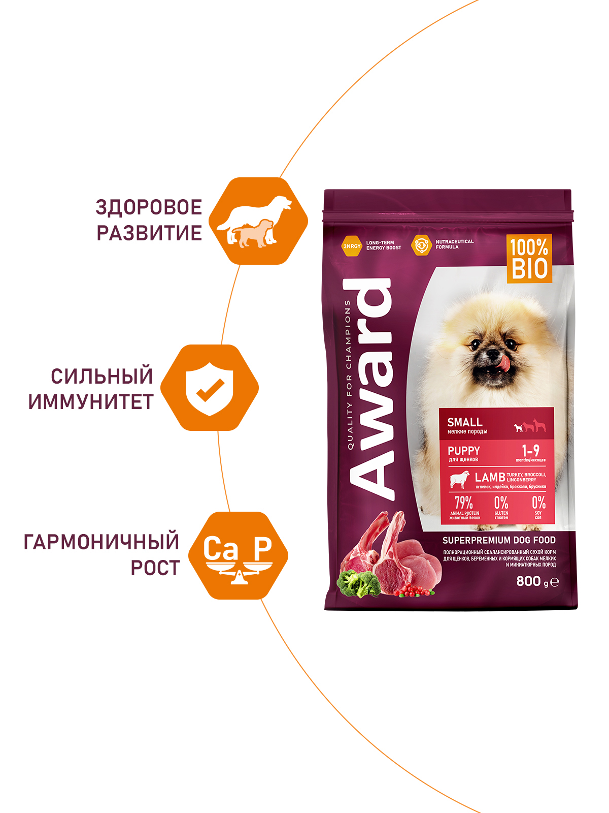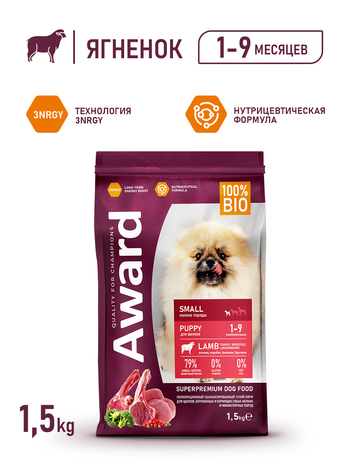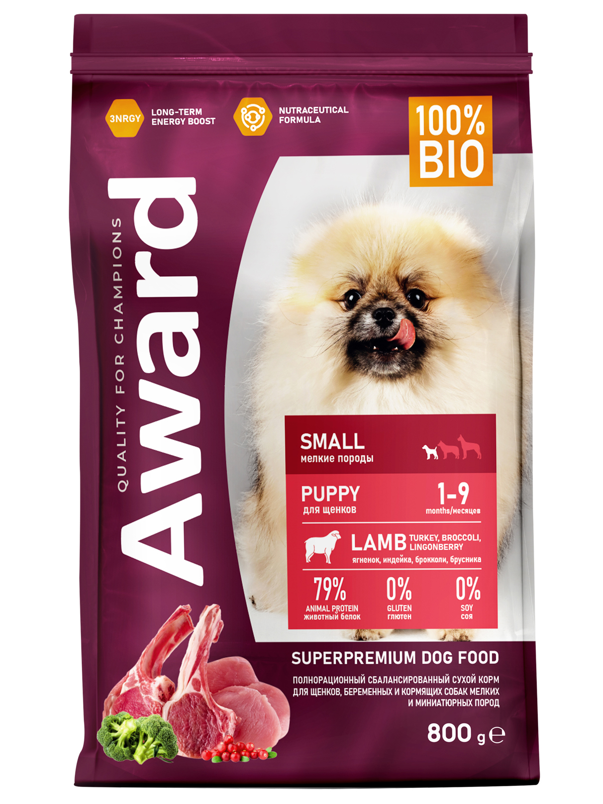 Сухой корм AWARD для щенков от 1 мес, беременных и кормящих сук мелких и мин. пород с ягненком и индейкой с добавлением брокколи и брусники.