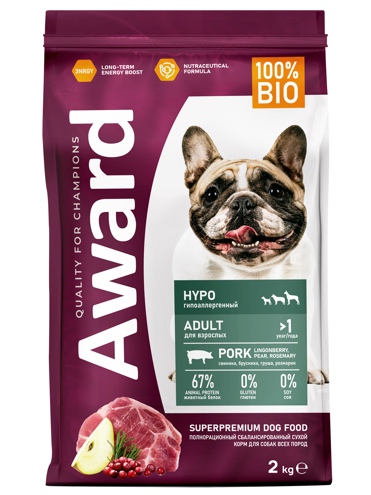 Сухой корм AWARD HYPO для взрослых собак всех пород со свининой с добавлением брусники, груши и розмарина.