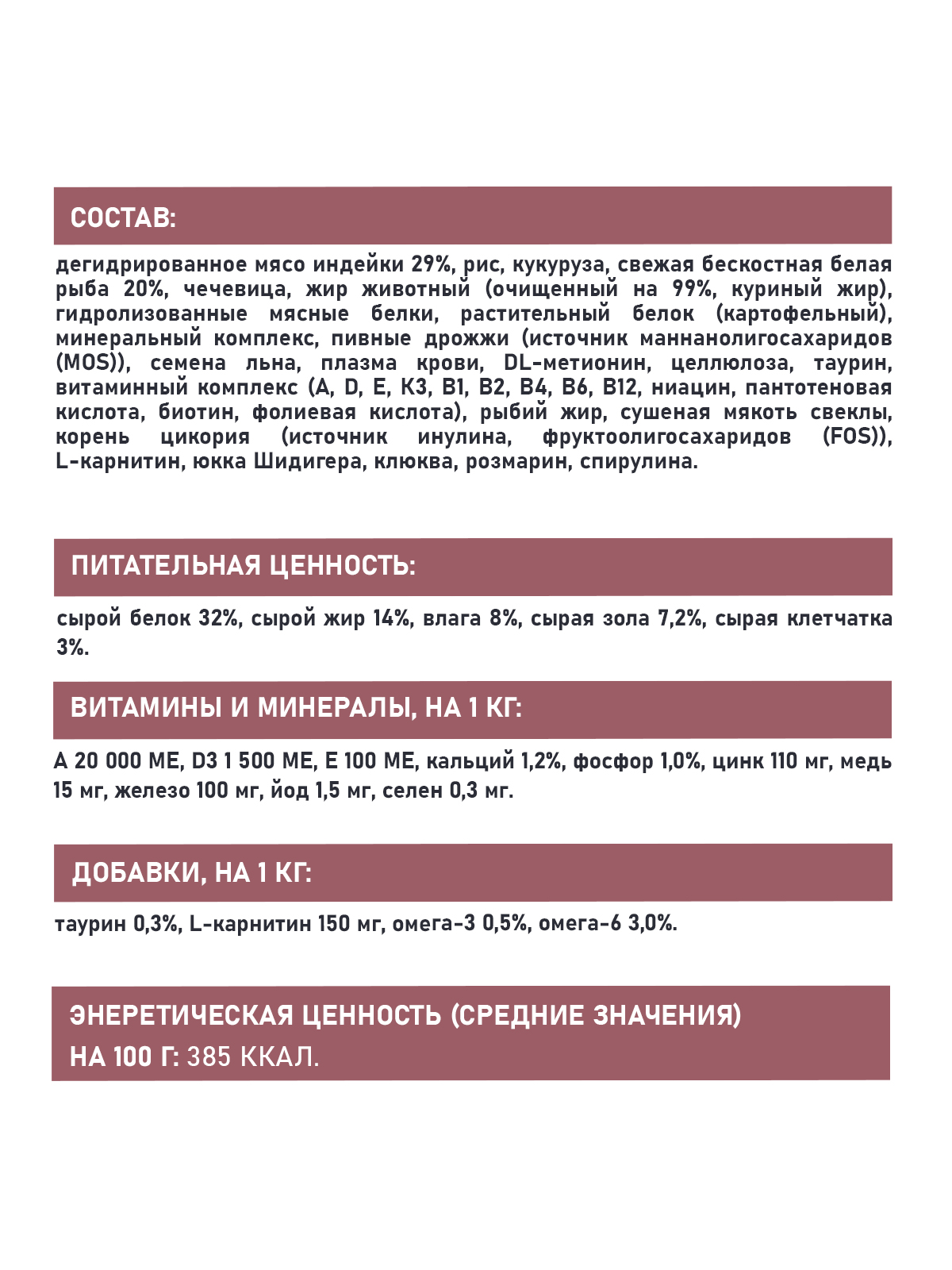 СОСТАВ: дегидрированное мясо индейки 29%, рис, кукуруза, свежая бескостная белая рыба 20%, чечевица, жир животный (очищенный на 99%, куриный жир), гидролизованные мясные белки, растительный белок (картофельный), минеральный комплекс, пивные дрожжи (источник маннанолигосахаридов (MOS)), семена льна, плазма крови, DL-метионин, целлюлоза, таурин, витаминный комплекс (А, D, E, К3, В1, В2, В4, В6, В12, ниацин, пантотеновая кислота, биотин, фолиевая кислота), рыбий жир, сушеная мякоть свеклы, корень цикория (источник инулина, фруктоолигосахаридов (FOS)), L-карнитин, юкка Шидигера, клюква, розмарин, спирулина.