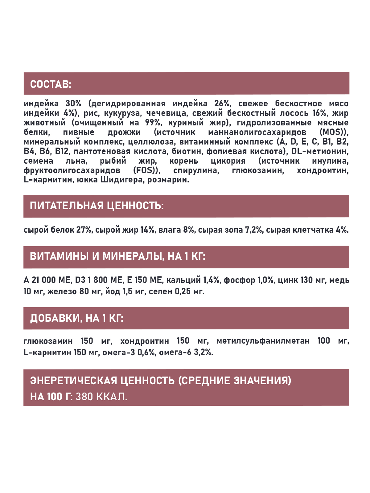 СОСТАВ: индейка 30% (дегидрированная индейка 26%, свежее бескостное мясо индейки 4%), рис, кукуруза, чечевица, свежий бескостный лосось 16%, жир животный (очищенный на 99%, куриный жир), гидролизованные мясные белки, пивные дрожжи (источник маннанолигосахаридов (MOS)), минеральный комплекс, целлюлоза, витаминный комплекс (A, D, E, C, B1, B2, B4, B6, B12, пантотеновая кислота, биотин, фолиевая кислота), DL-метионин, семена льна, рыбий жир, корень цикория (источник инулина, фруктоолигосахаридов (FOS)), спирулина, глюкозамин, хондроитин, L-карнитин, юкка Шидигера, розмарин.