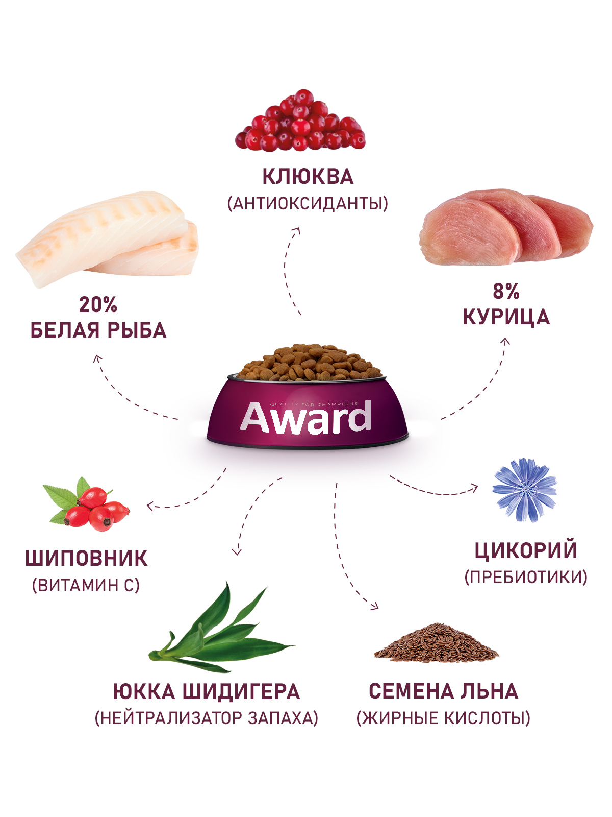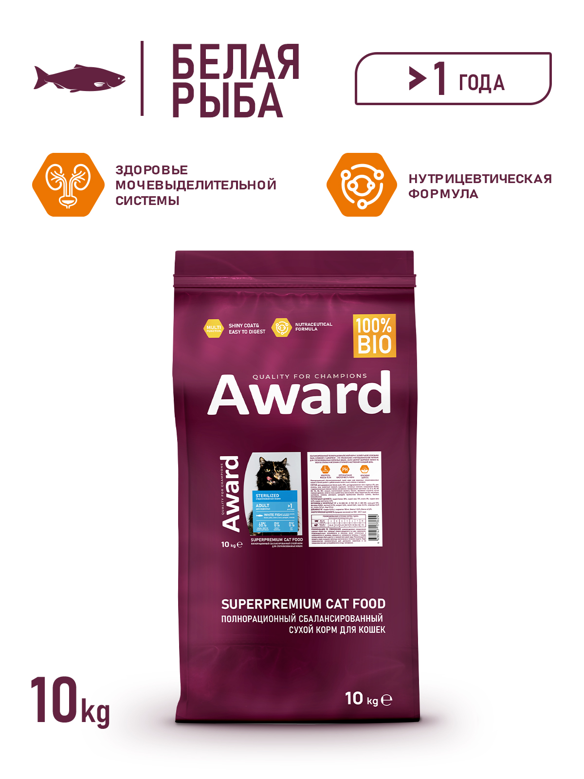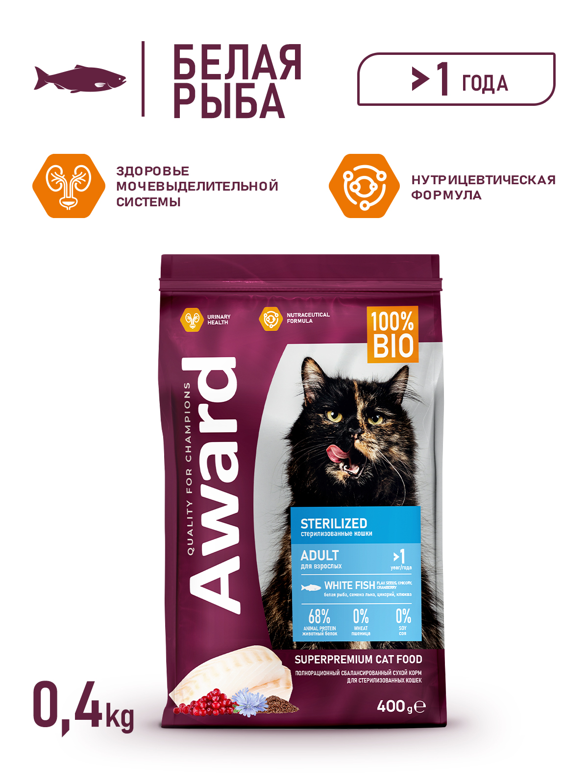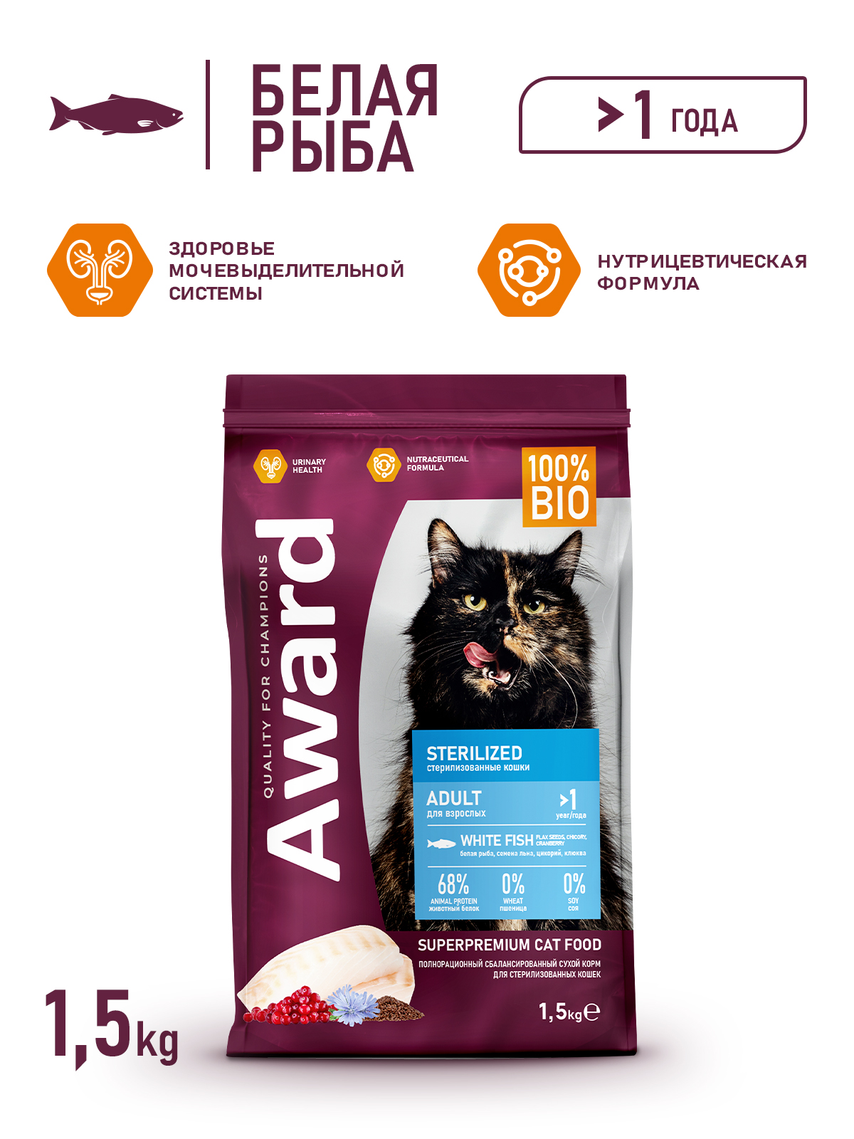 Сухой корм AWARD Sterilized для взрослых стерилизованных кошек с белой рыбой с добавлением семян льна, клюквы и цикория 1,5 кг.