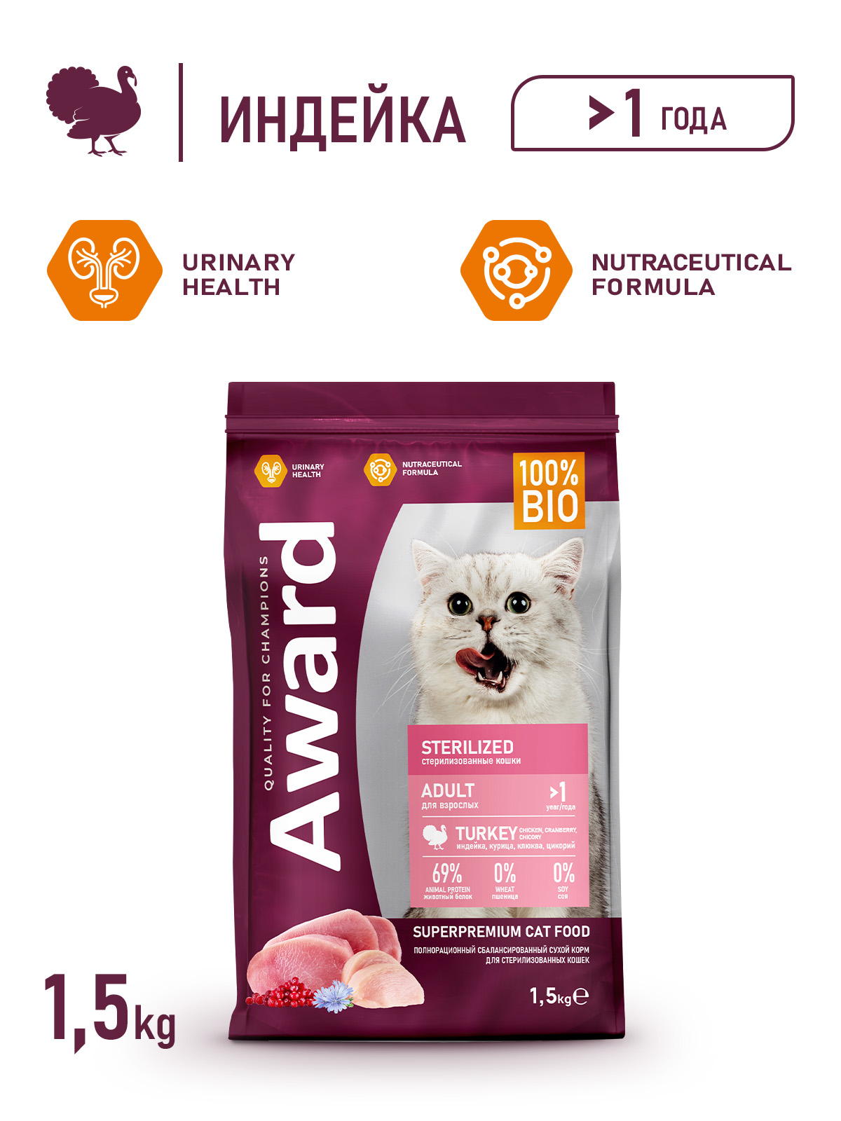 Сухой корм AWARD Sterilized для взрослых стерилизованных кошек с индейкой и курицей с добавлением клюквы и цикория 1,5 кг.