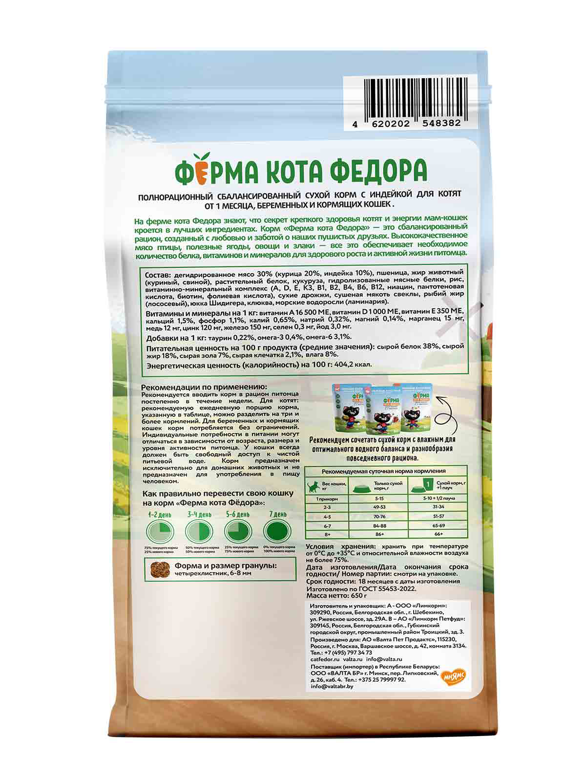 На ферме кота Федора знают, что секрет крепкого здоровья котят и энергии мам-кошек кроется в лучших ингредиентах. Корм «Ферма кота Федора» - это сбалансированный рацион, созданный с любовью и заботой о наших пушистых друзьях. Высококачественное мясо птицы, полезные ягоды, овощи и злаки - все это обеспечивает необходимое количество белка, витаминов и минералов для здоровой и активной жизни питомца.