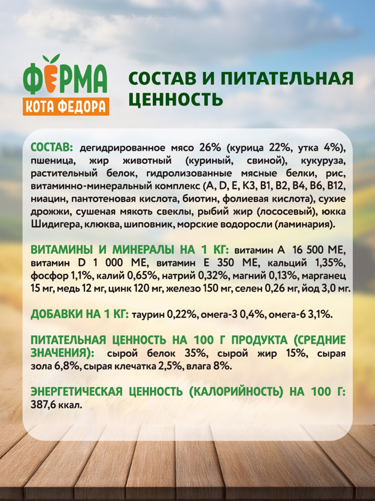 Состав: дегидрированное мясо 26% (курица 22%, утка 4 %), пшеница, жир животный (куриный, свиной), кукуруза, растительный белок, гидролизованные мясные белки, рис, витаминно-минеральный комплекс (A, D, E, К3, B1, B2, B4, B6, B12, ниацин, пантотеновая кислота, биотин, фолиевая кислота), сухие дрожжи, сушеная мякоть свеклы, рыбий жир (лососевый), юкка Шидигера, клюква, шиповник, морские водоросли (ламинария).
