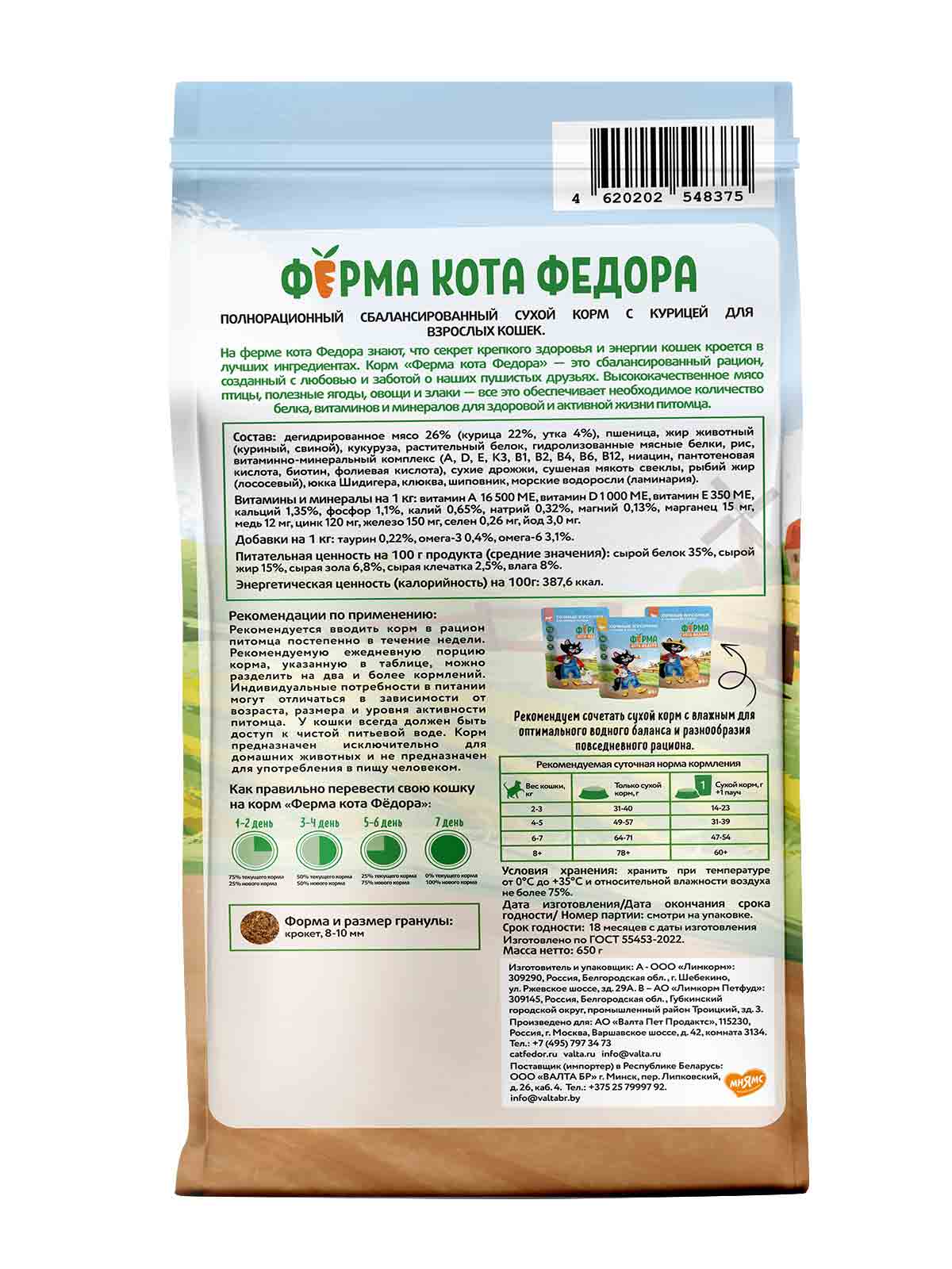 На ферме кота Федора знают, что секрет крепкого здоровья и энергии кошек кроется в лучших ингредиентах. Корм «Ферма кота Федора» - это сбалансированный рацион, созданный с любовью и заботой о наших пушистых друзьях. Высококачественное мясо птицы, полезные ягоды, овощи и злаки - все это обеспечивает необходимое количество белка, витаминов и минералов для здоровой и активной жизни питомца.
