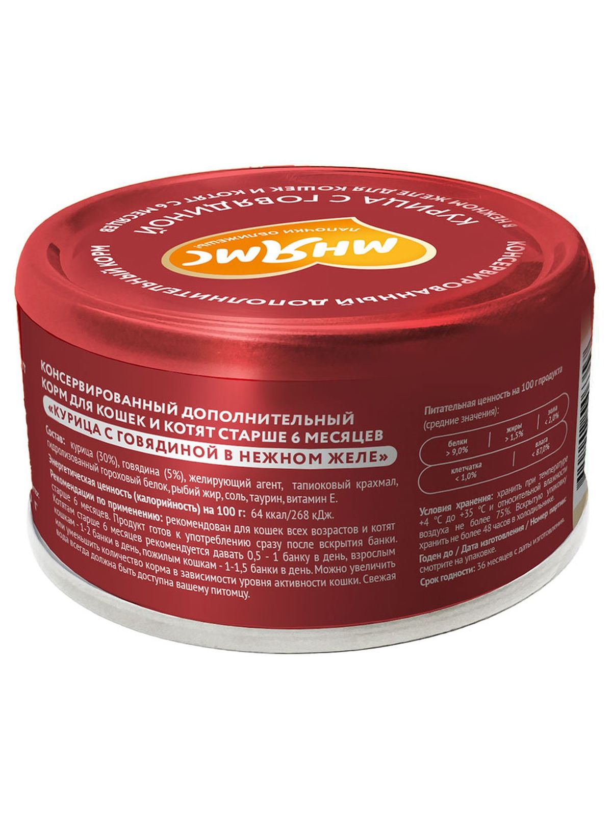 «Мнямс» консервированный дополнительный корм для для кошек и котят старше 6 месяцев «Курица в нежном желе" гарантирует, что ваш питомец получит только качественный и вкусный продукт, который прекрасно разнообразит его рацион, поддержит здоровье и обеспечит энергией.