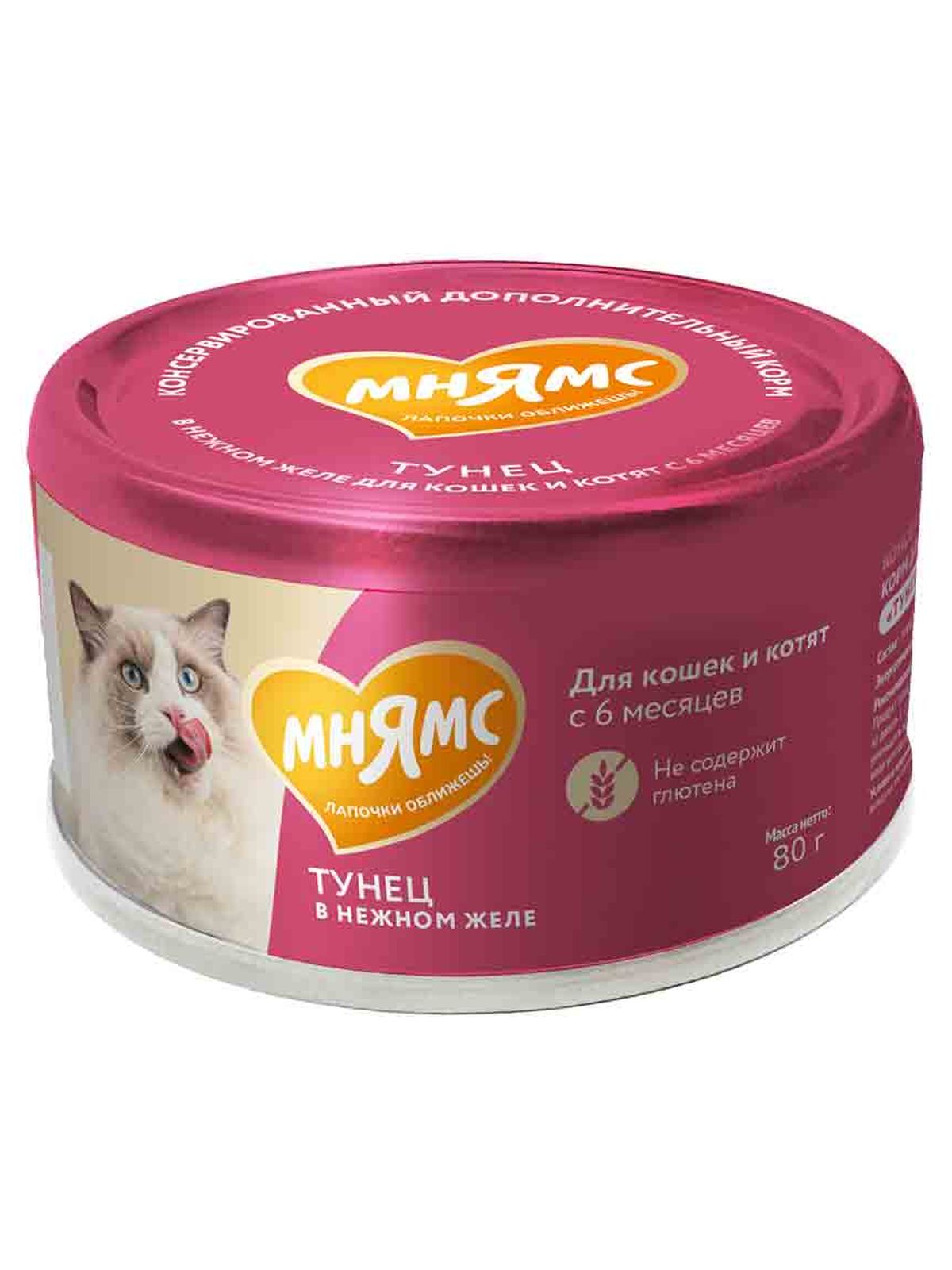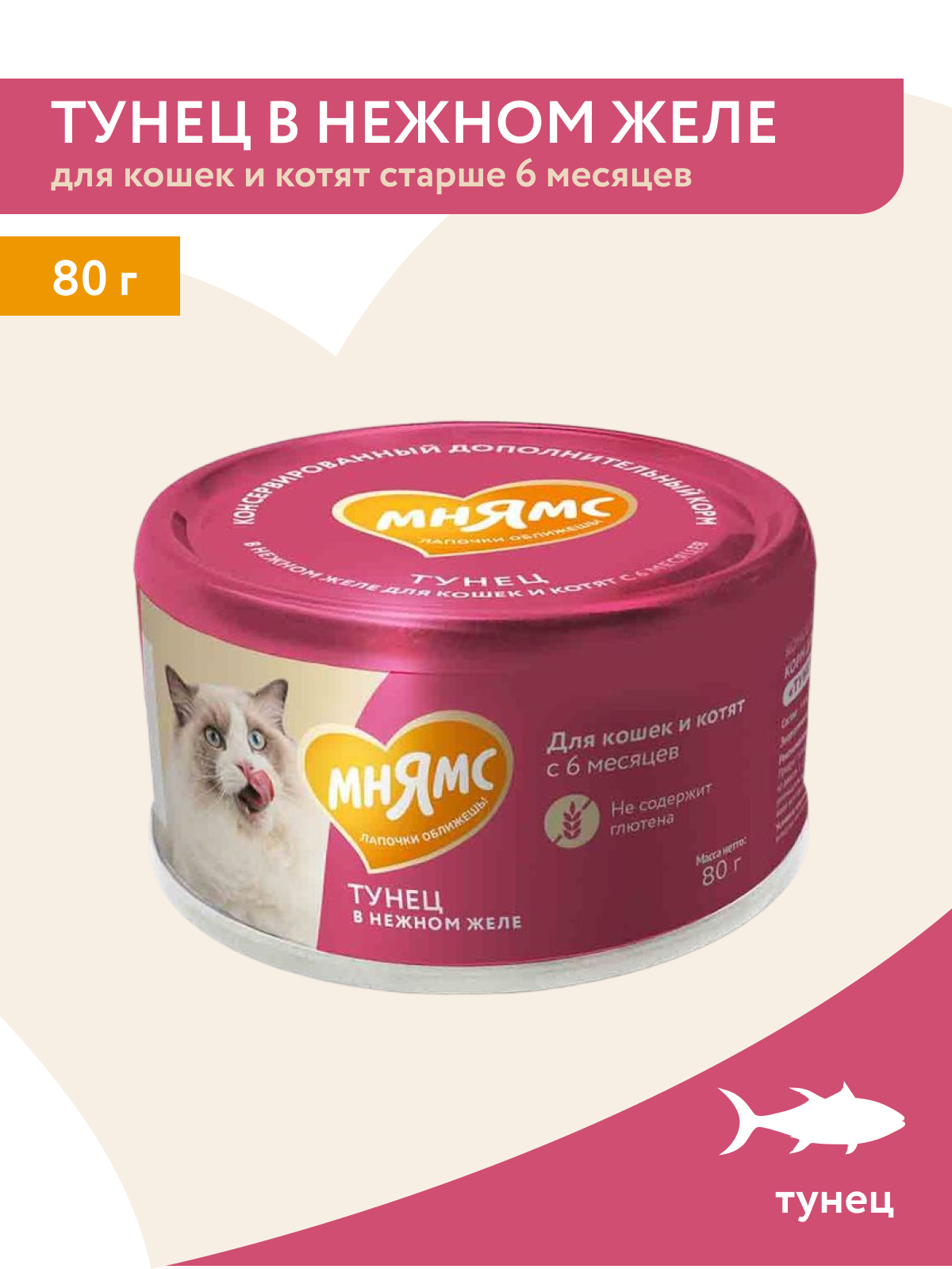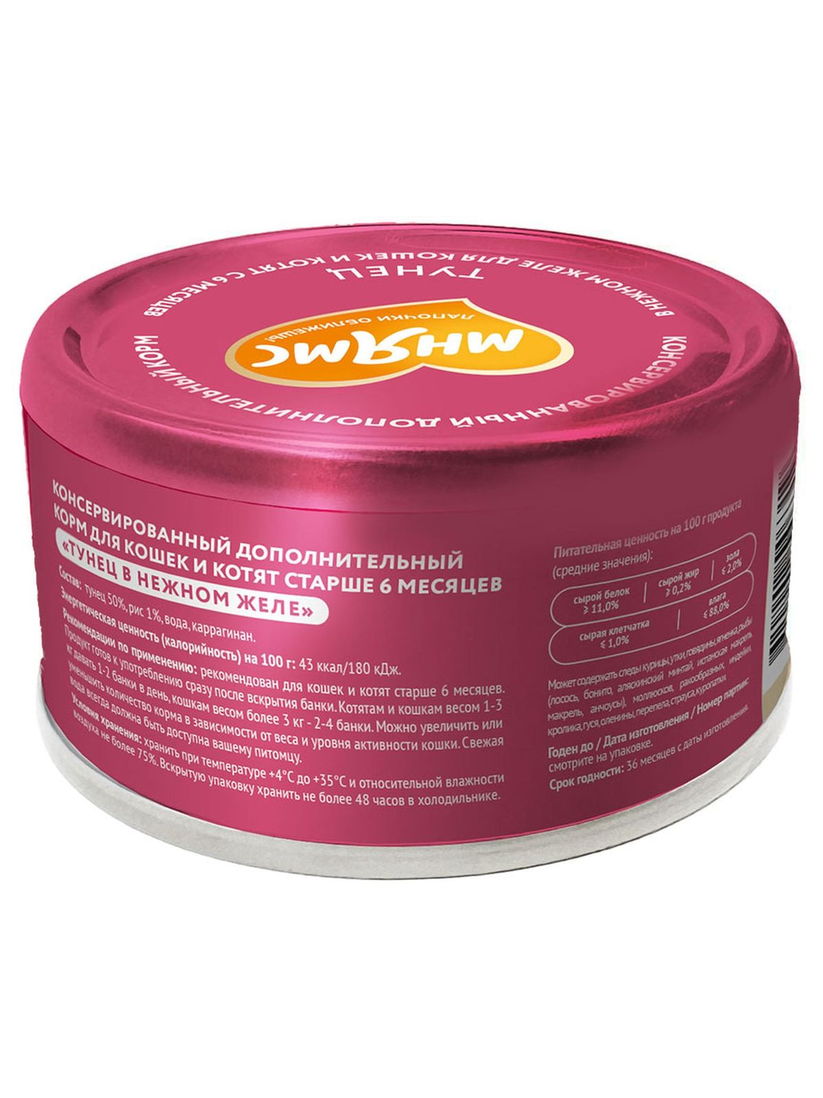 «Мнямс» консервированный дополнительный корм для для кошек и котят старше 6 месяцев "Тунец в нежном желе" гарантирует, что ваш питомец получит только качественный и вкусный продукт, который прекрасно разнообразит его рацион, поддержит здоровье и обеспечит энергией.