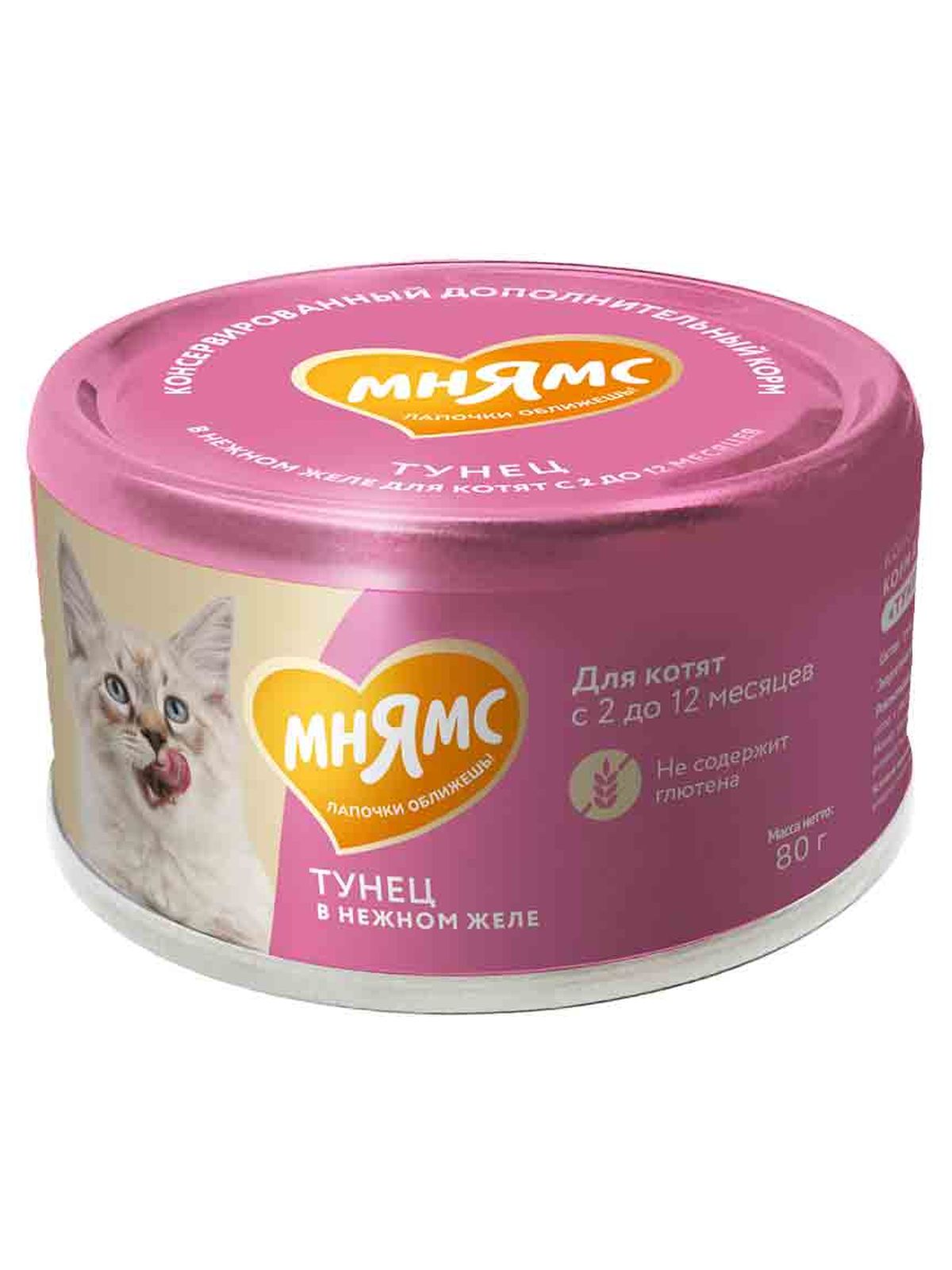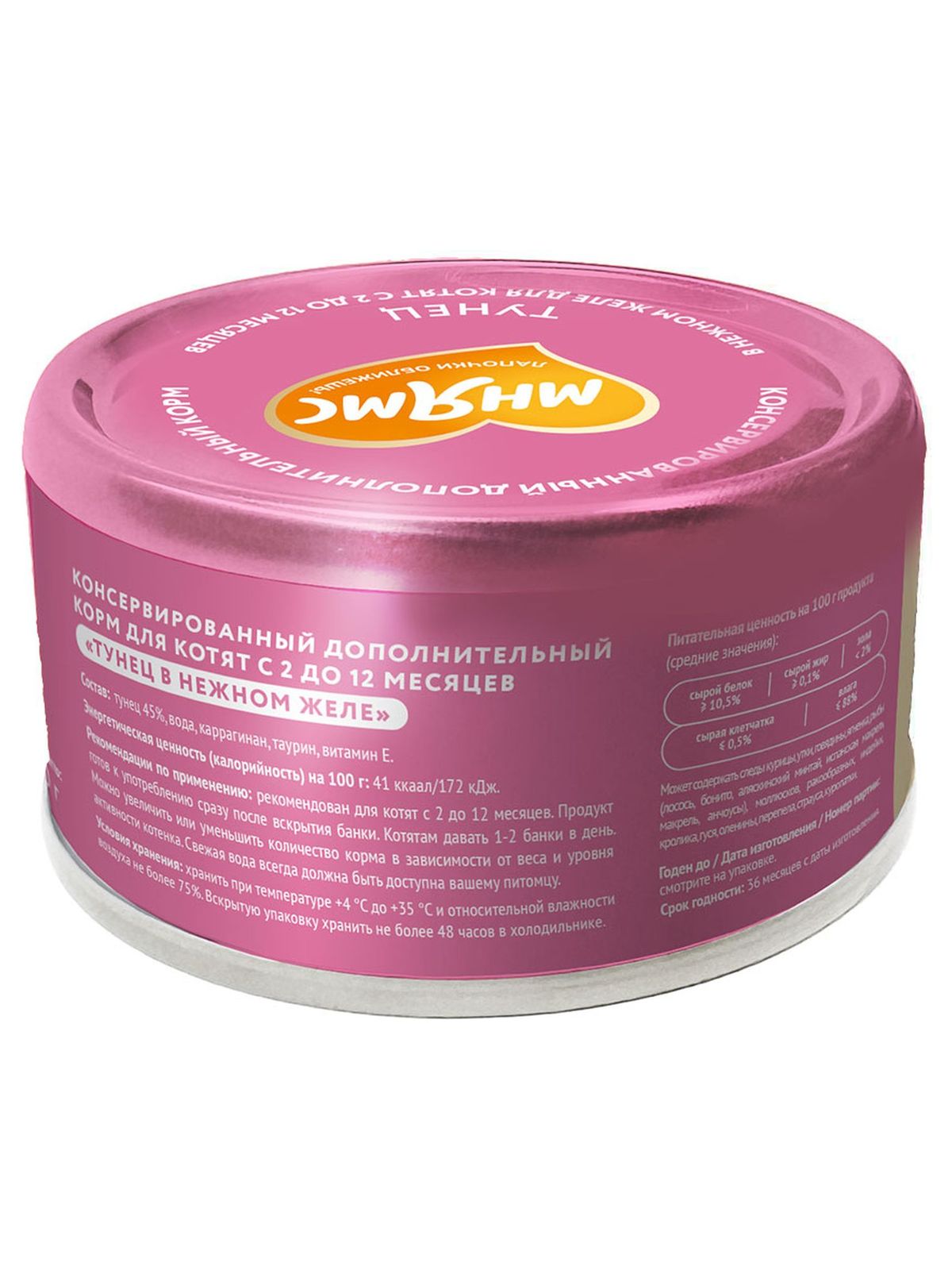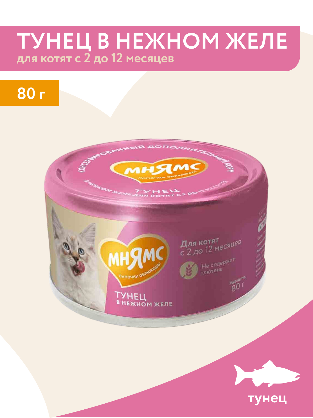 «Мнямс» консервированный дополнительный корм для котят с 2 до 12 месяцев "Тунец в нежном желе" гарантирует, что ваш питомец получит только качественный и вкусный продукт, который прекрасно разнообразит его рацион, поддержит здоровье и обеспечит энергией.