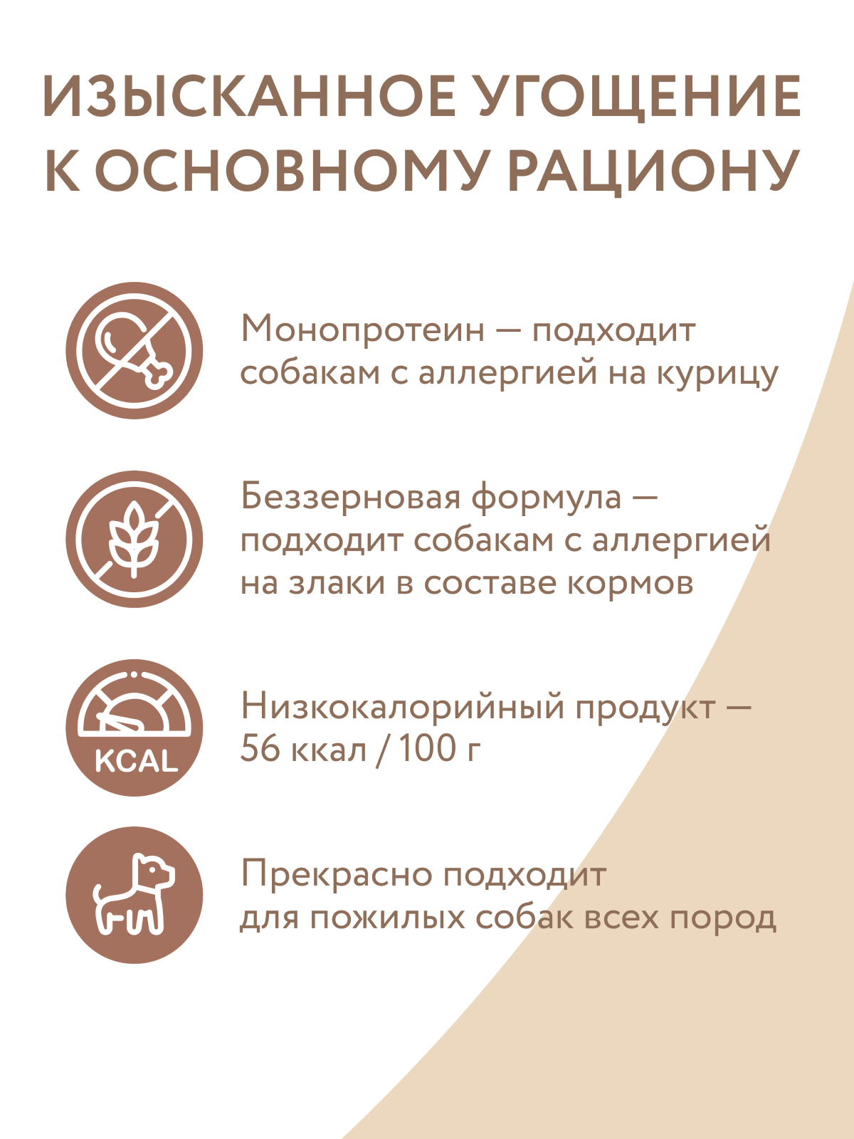 Прекрасно подходит пожилым собакам, а также питомцам с чувствительной кожей и аллергией на курицу или злаки в составе кормов.
