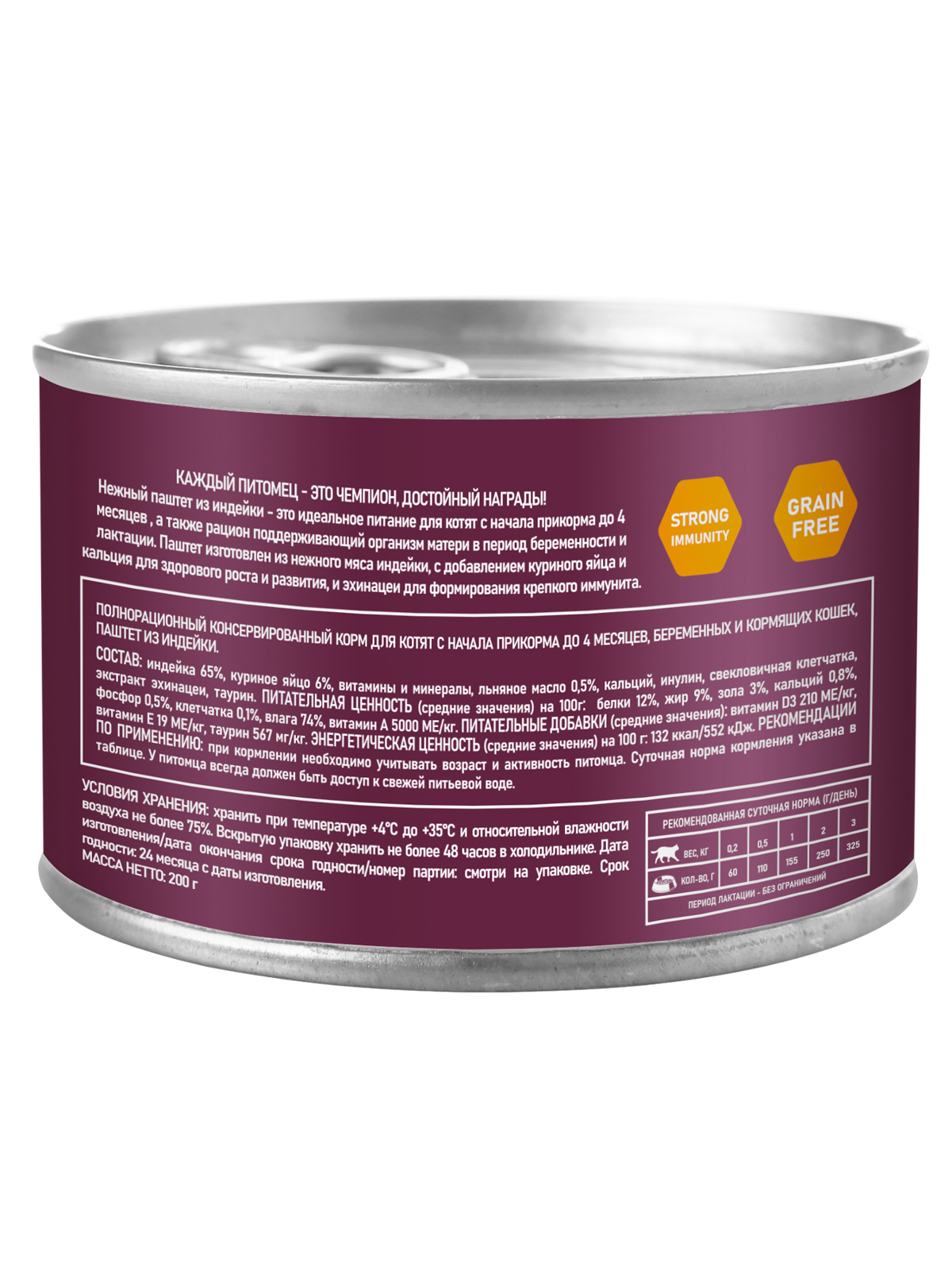 Паштет изготовлен из нежного мяса индейки, с добавлением яйца и кальция для здорового роста и развития, и эхинацеи для формирования крепкого иммунитета.