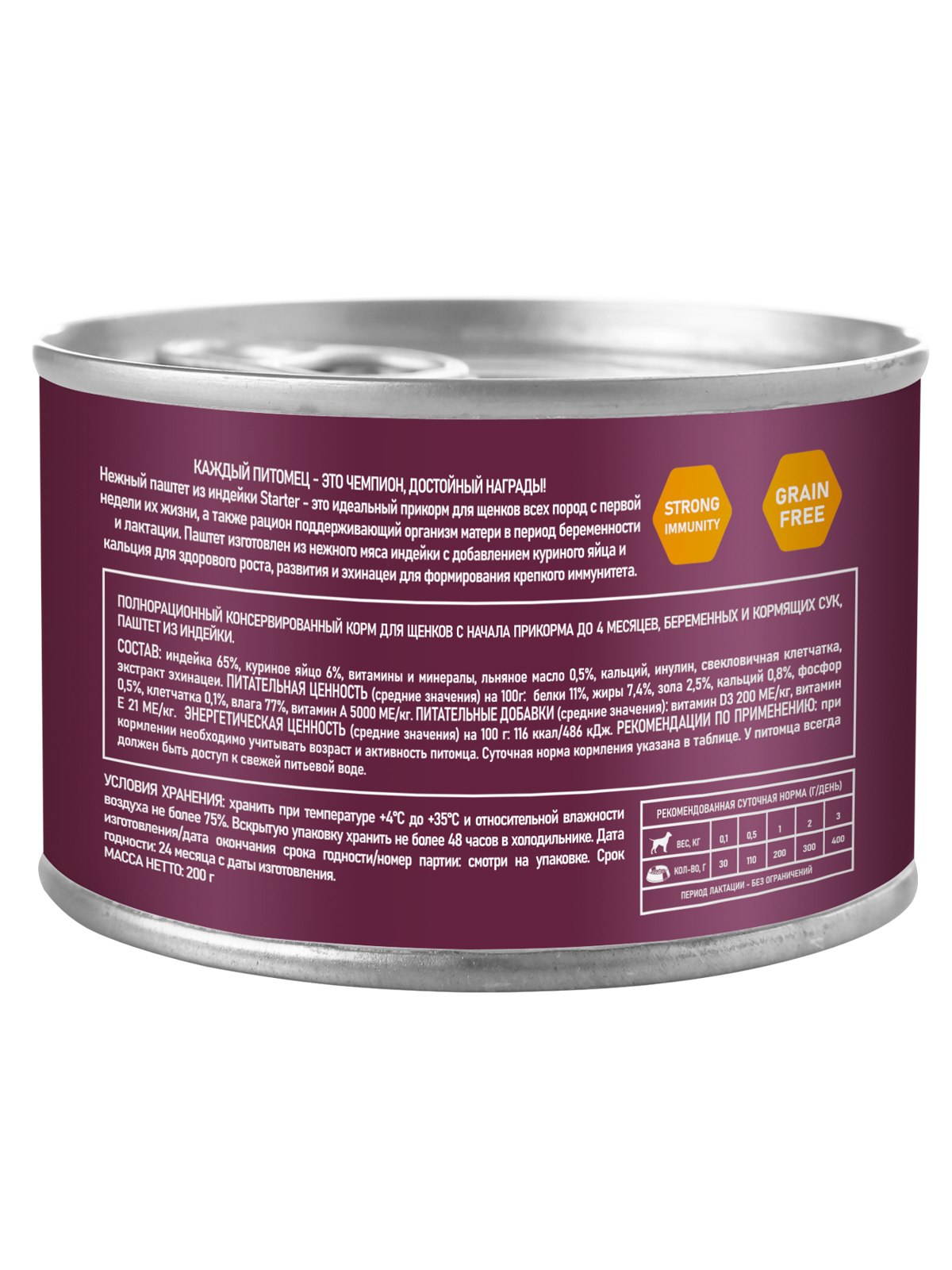 Паштет изготовлен из нежного мяса индейки, с добавлением яйца и кальция для здорового роста и развития, и эхинацеи для формирования крепкого иммунитета.