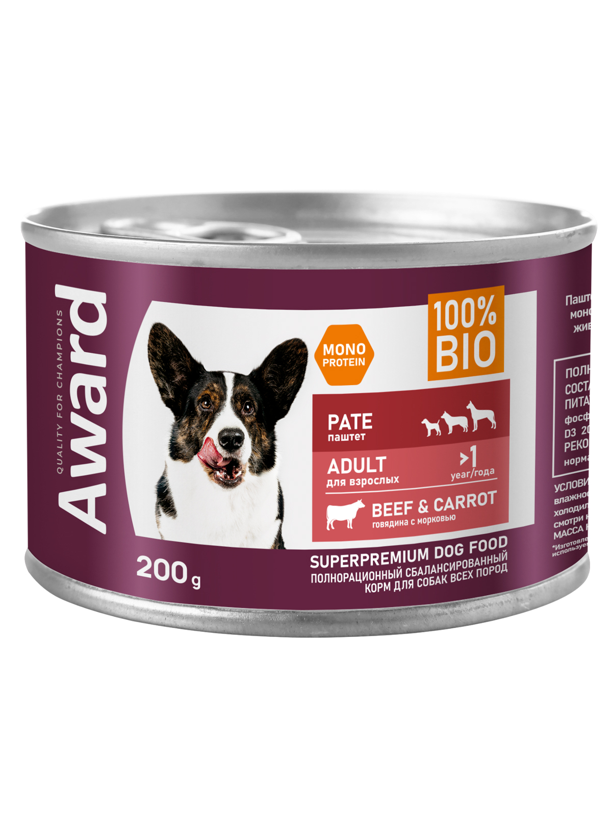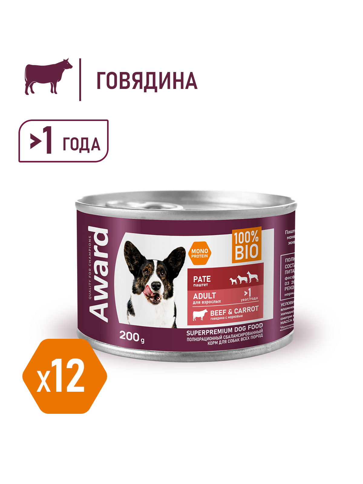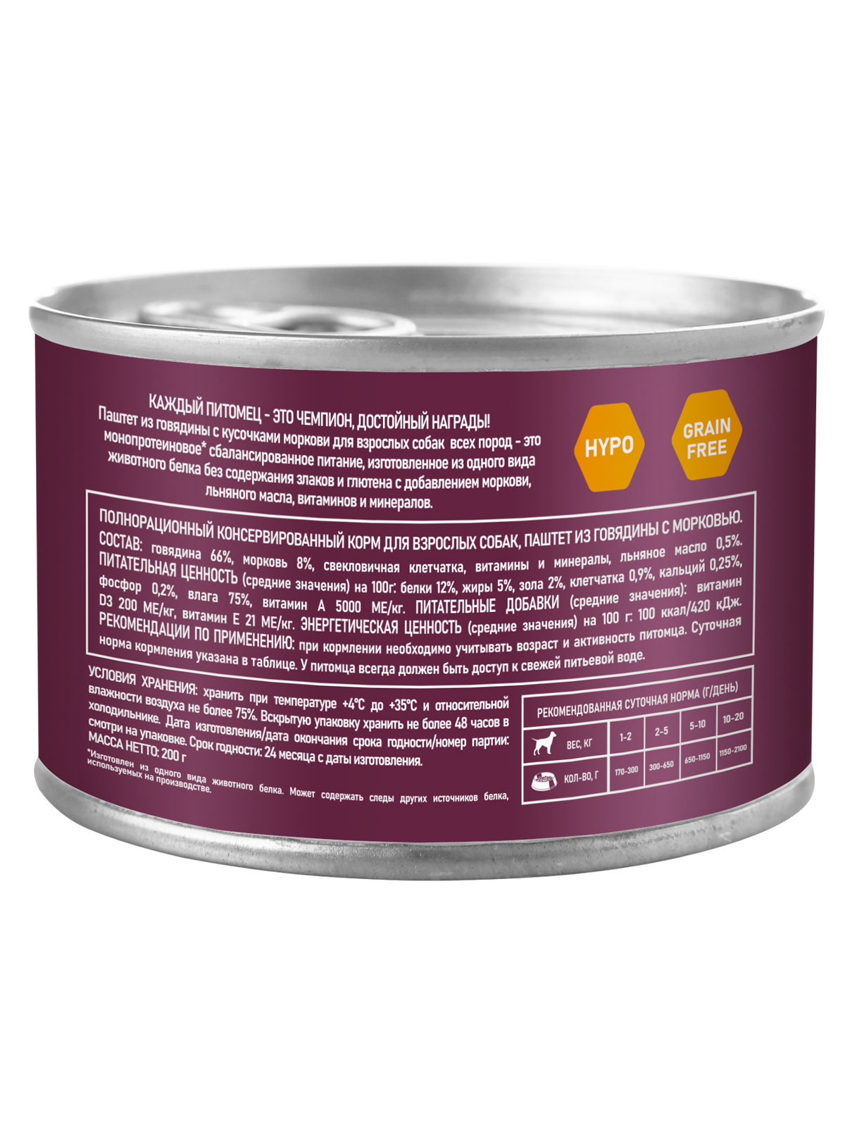 Паштет из говядины с кусочками моркови для взрослых собак - это монопротеиновое сбалансированное питание для любимого питомца, изготовленное из одного вида мясного белка без содержания зерна и глютена, с добавлением овощей и фруктов богатых витаминами и минералами.