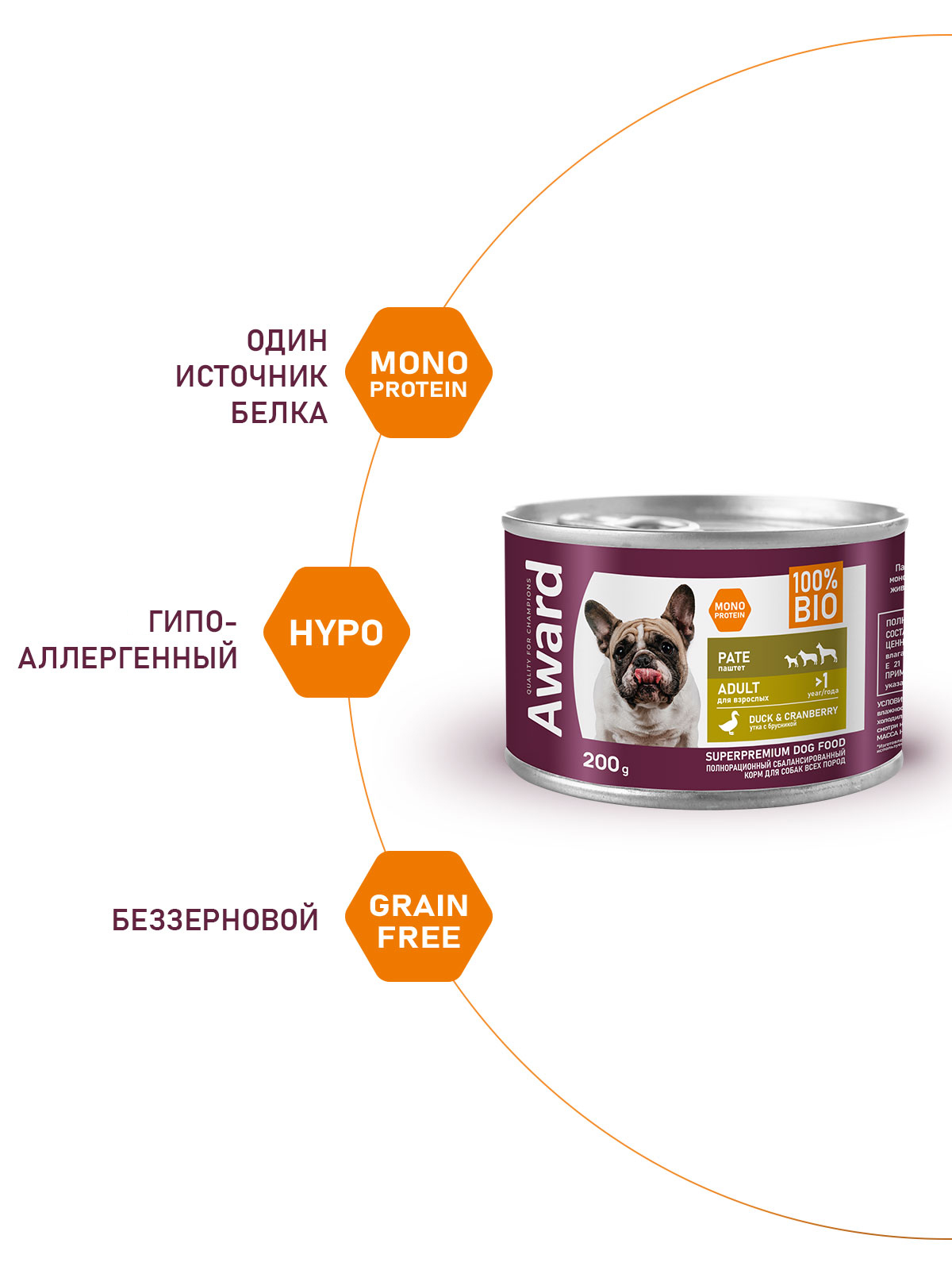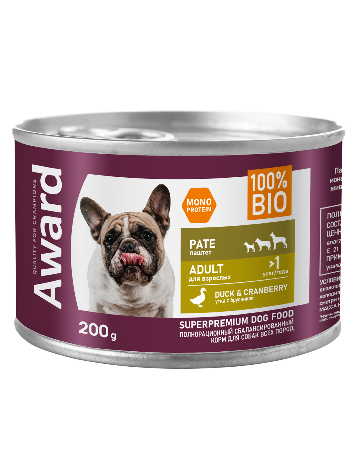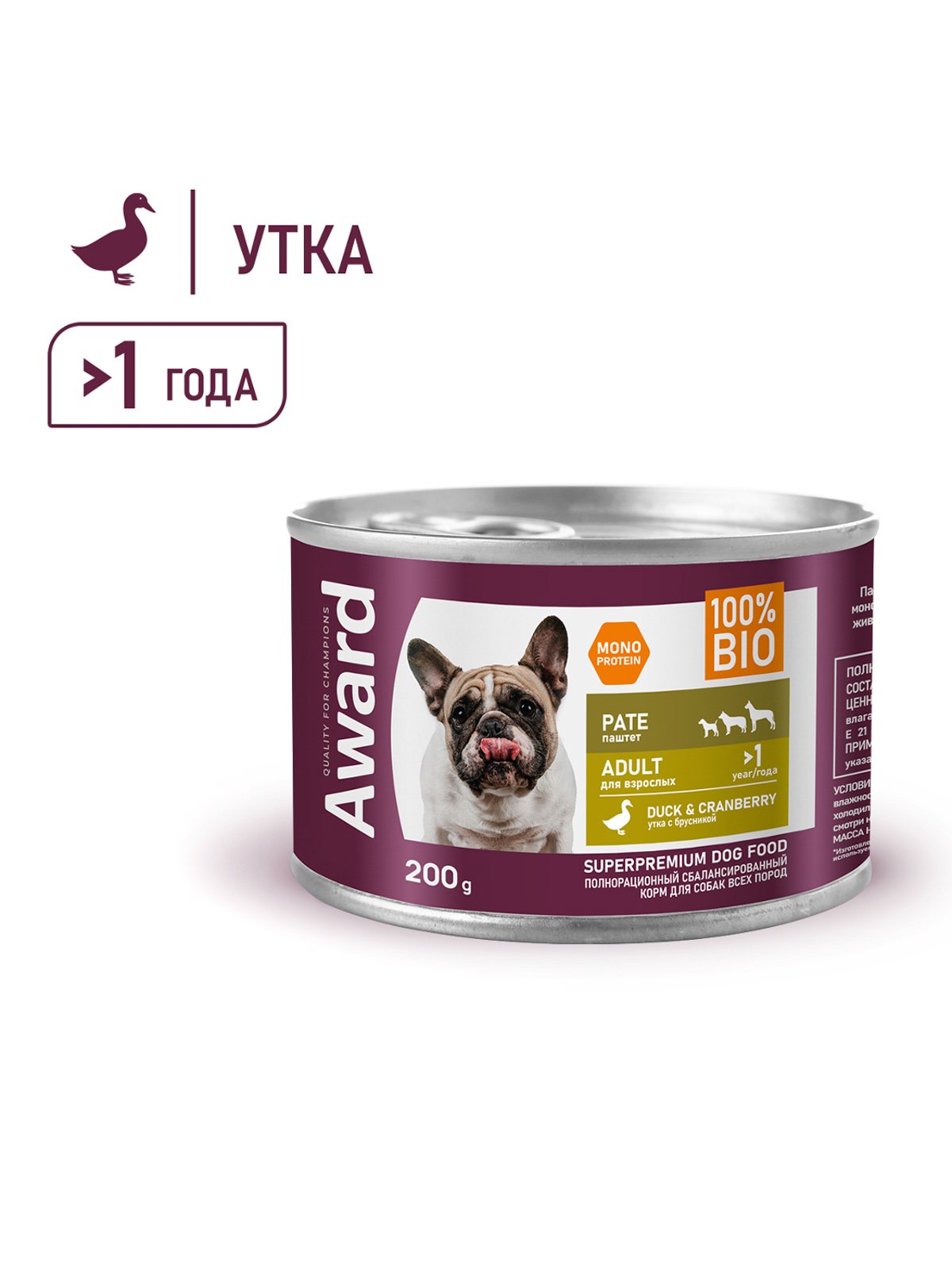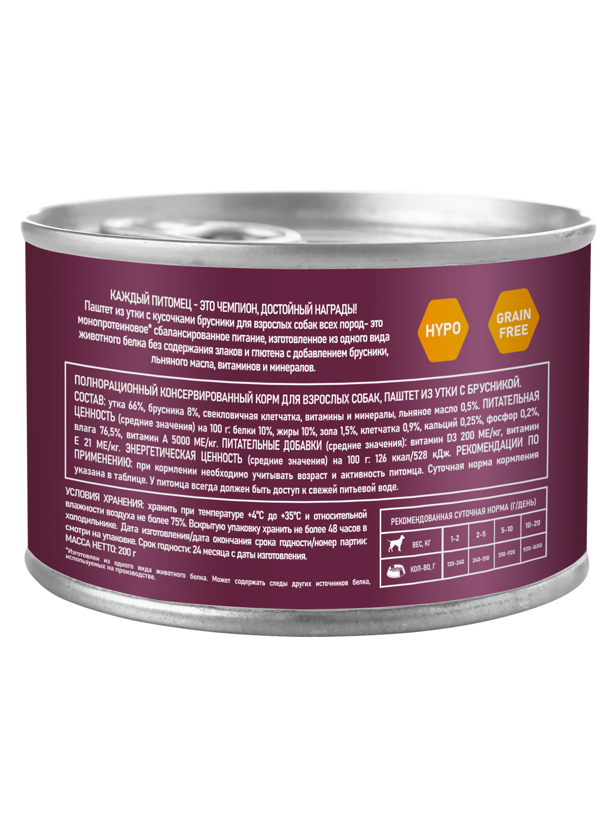 Паштет из утки с кусочками брусники для взрослых собак - это монопротеиновое сбалансированное питание для любимого питомца, изготовленное из одного вида мясного белка без содержания зерна и глютена, с добавлением овощей и фруктов богатых витаминами и минералами.