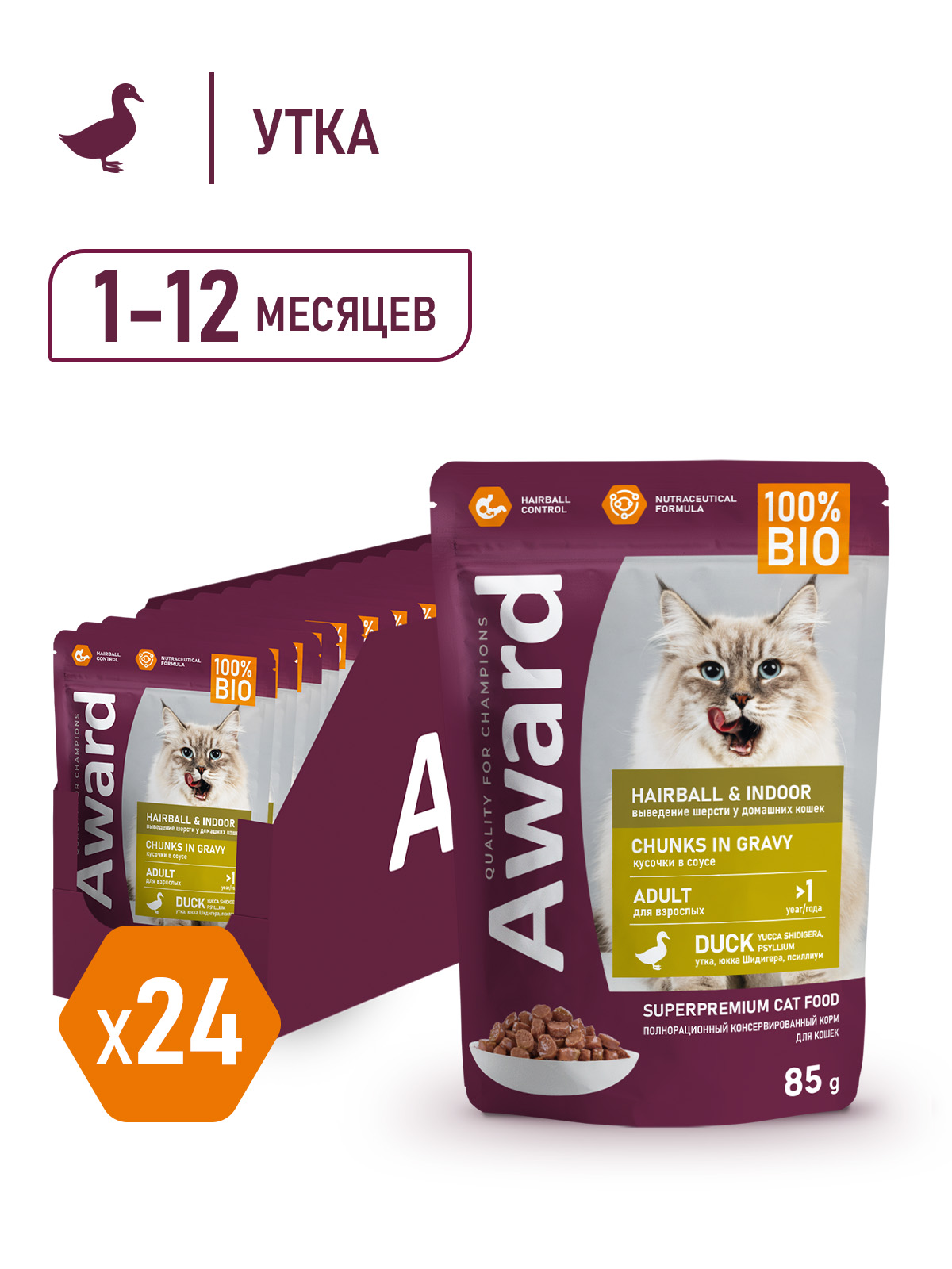 AWARD Полнорационный консервированный корм «Hairball & Indoor» для выведения шерсти у взрослых домашних кошек, кусочки в соусе с уткой 85 г.