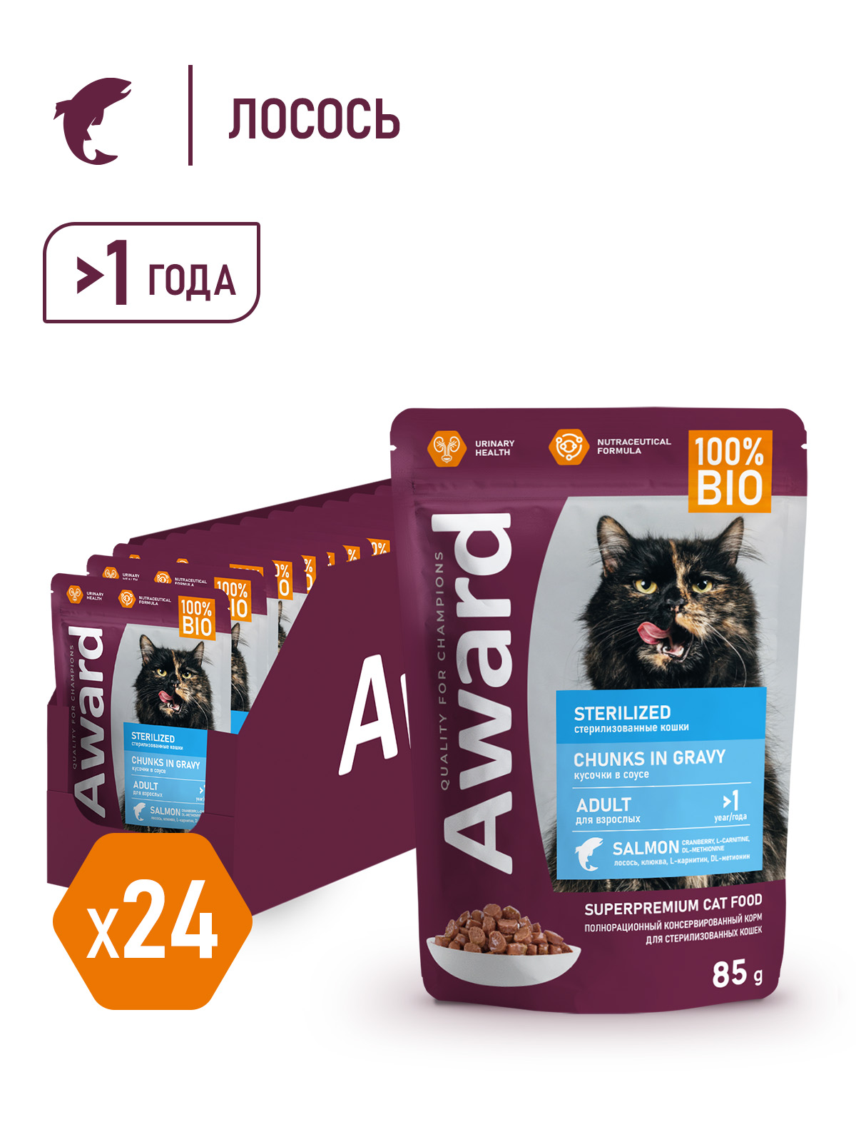 AWARD Полнорационный консервированный корм «Sterilized» для взрослых стерилизованных кошек, кусочки в соусе с лососем 85 г.