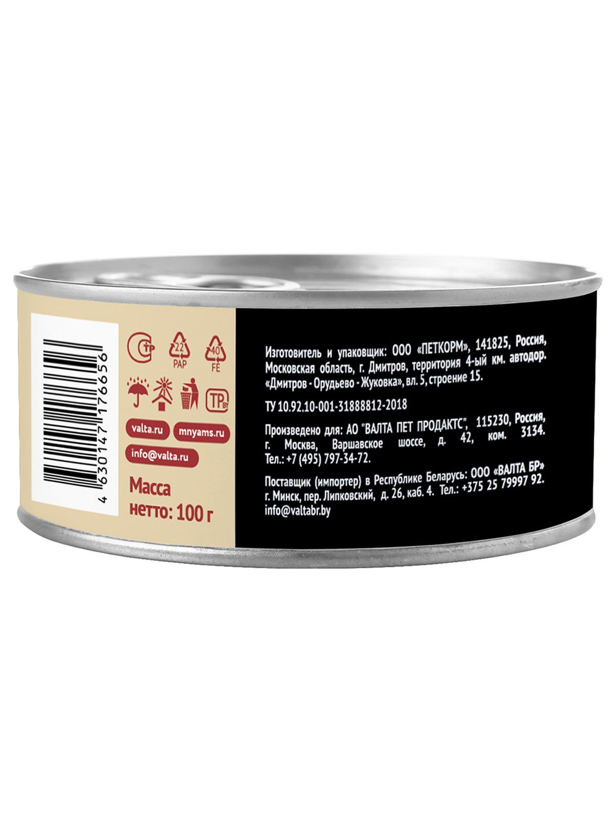Питательная ценность на 100 г: белки 12,5%, жиры 10%, клетчатка 0,3%, зола 2,0%, кальций 0,22%, фосфор 0,18%, магний 0,015%, влага 73%, витамин А 6000 МЕ/кг, витамин D3 200 МЕ/кг, витамин Е 20 МЕ/кг, таурин 600 мг/кг, железо 40 мг/кг, медь 3 мг/кг, марганец 2 мг/кг, цинк 35 мг/кг.