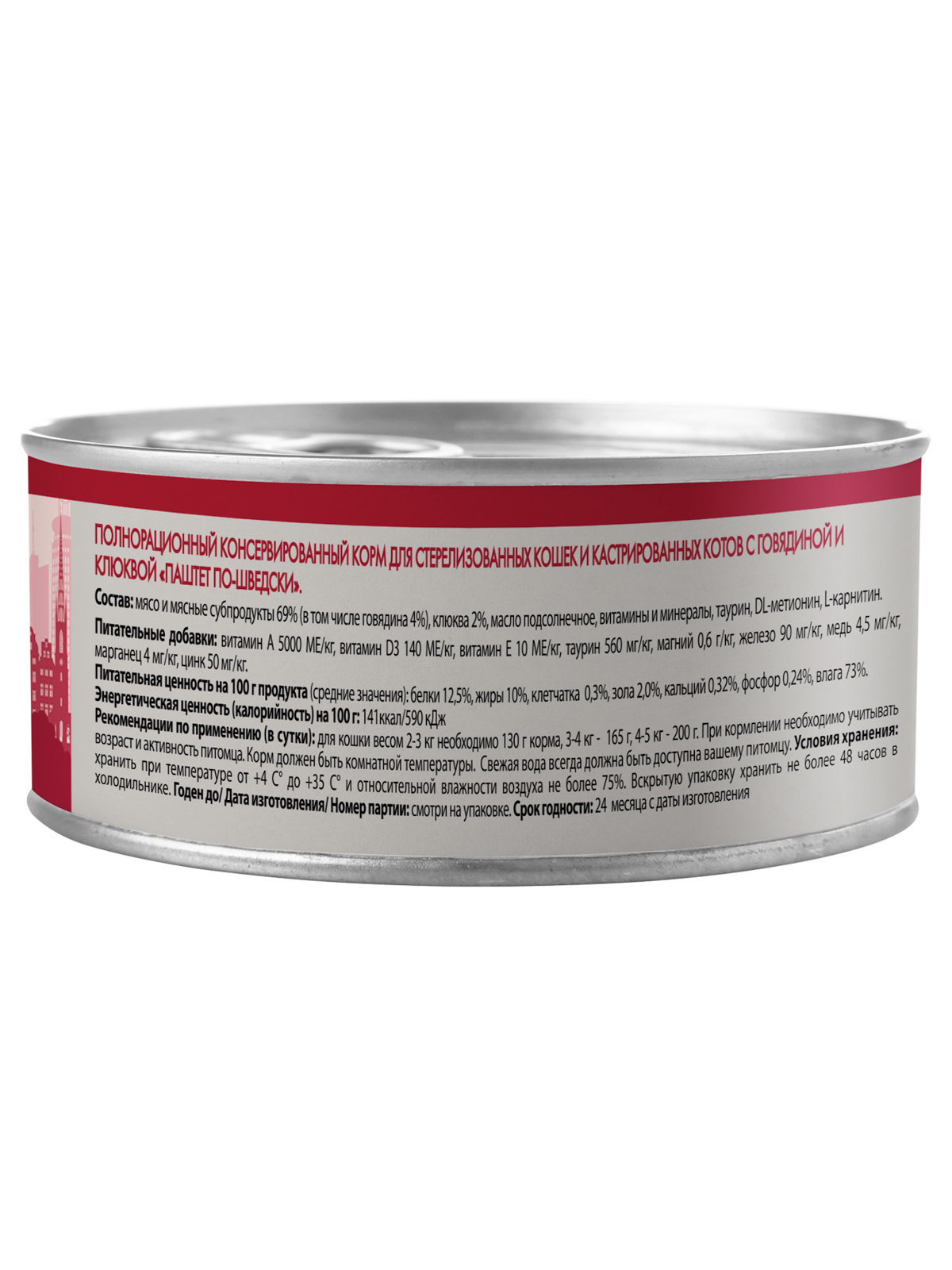 Полнорационный сбалансированный влажный корм с говядиной и клюквой для стерилизованных кошек и кастрированных котов старше 12 месяцев, созданный по мотивам блюд высокой кухни. "Паштет по-шведски" содержит высокое количество животного белка (69%), клюкву, витамины и минералы, таурин, DL-метионин, L-карнитин, обеспечивающие контроль веса и снижающие риск развития мочекаменной болезни.