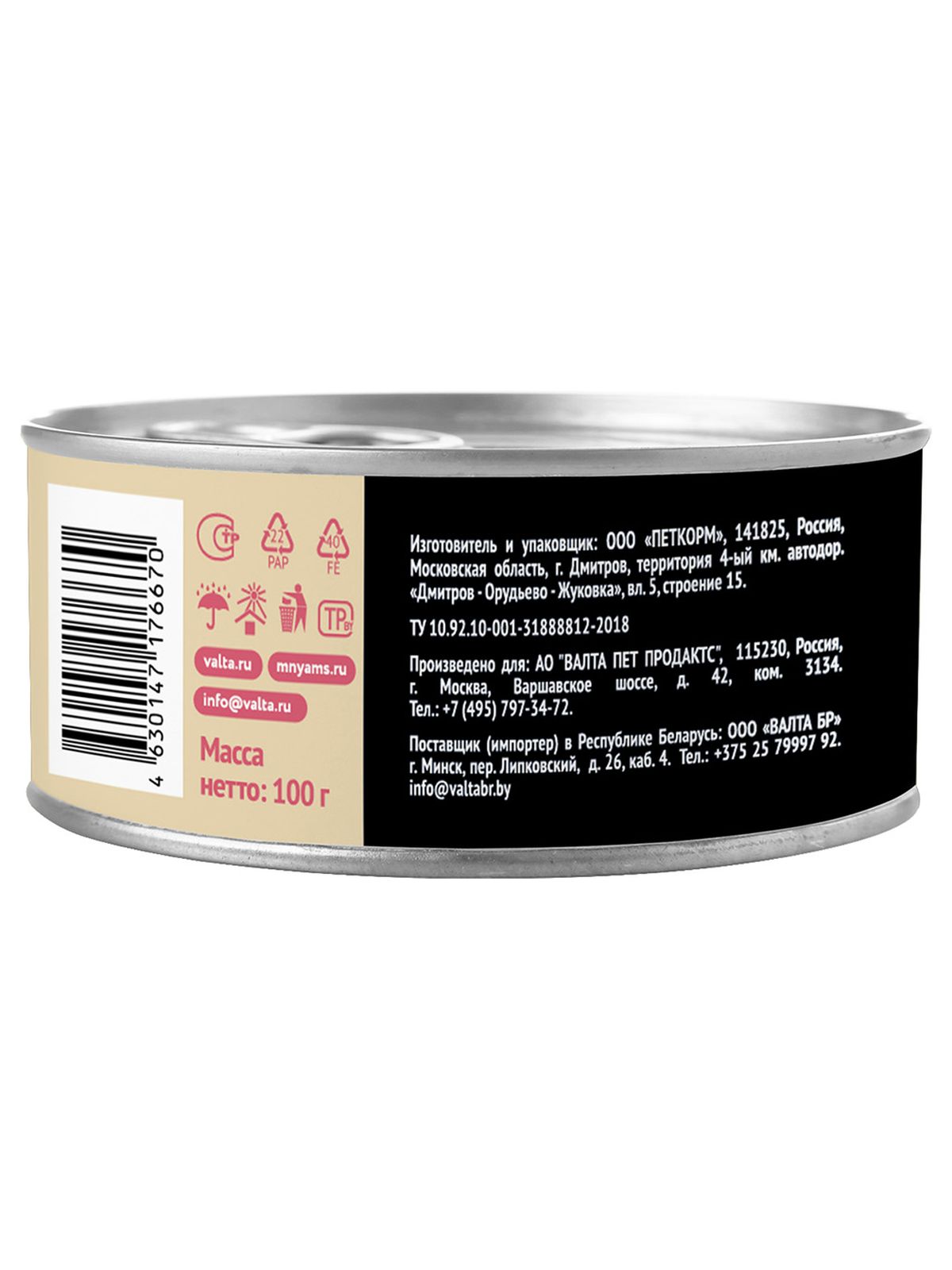 Питательная ценность на 100 г: белки 12,5%, жиры 10%, клетчатка 0,3%, зола 2,4%, кальций 0,22%, фосфор 0,18%, магний 0,015%, влага 73%, витамин А 6000 МЕ/кг, витамин D3 200 МЕ/кг, витамин Е 20 МЕ/кг, таурин 600 мг/кг, железо 40 мг/кг, медь 3 мг/кг, марганец 2 мг/кг, цинк 35 мг/кг.