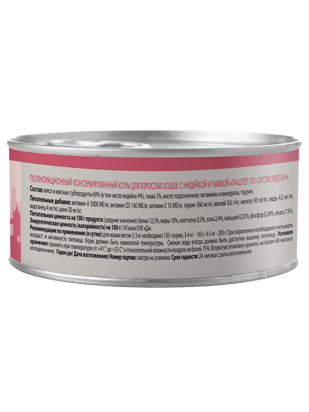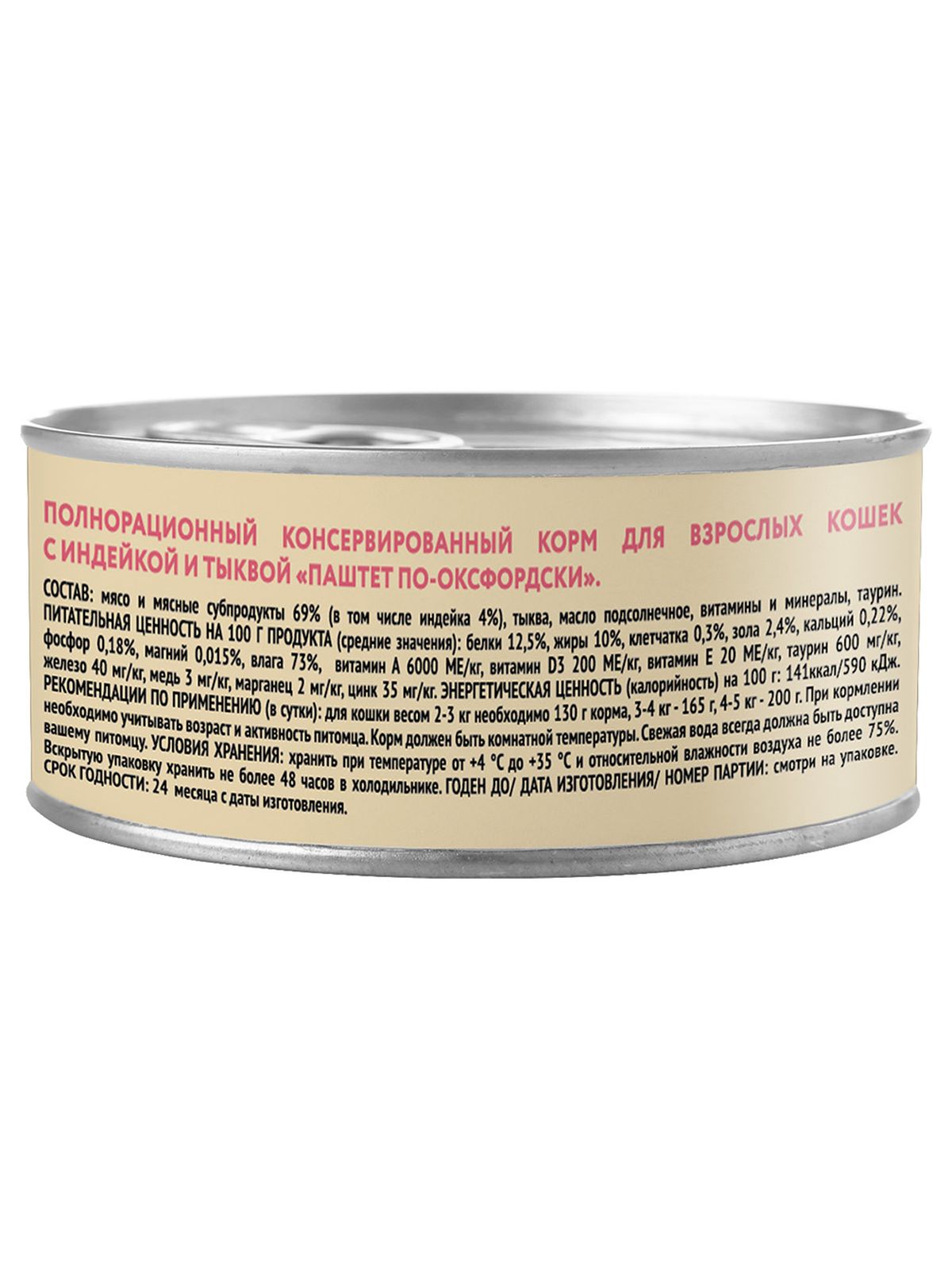Полнорационный сбалансированный влажный корм с индейкой и тыквой для кошек старше 12 месяцев, созданный по мотивам блюд высокой кухни. "Паштет по-оксфордски" содержит высокое количество животного белка (69%), тыкву, таурин, а также все необходимые витамины и минералы для поддержания здоровья и активности кошки на протяжении всей ее жизни.