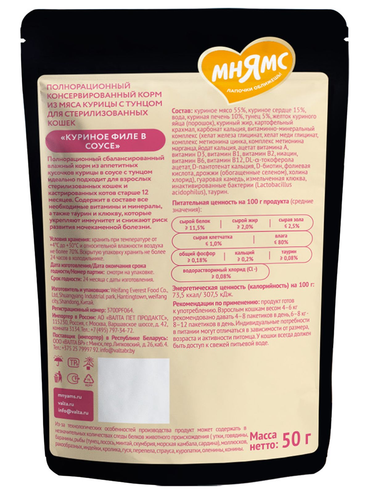 ПИТАТЕЛЬНАЯ ЦЕННОСТЬ НА 100 Г ПРОДУКТА (СРЕДНИЕ ЗНАЧЕНИЯ): сырой белок ≥ 11,5%, сырой жир ≥ 2,0%, сырая зола ≤ 2,5%, сырая клетчатка ≤ 1,0%, общий фосфор ≥ 0,18%, кальций ≥ 0,2%, водорастворимый хлорид (Cl -) ≥ 0,08%, таурин ≥ 0,08%, влага ≤ 80%.