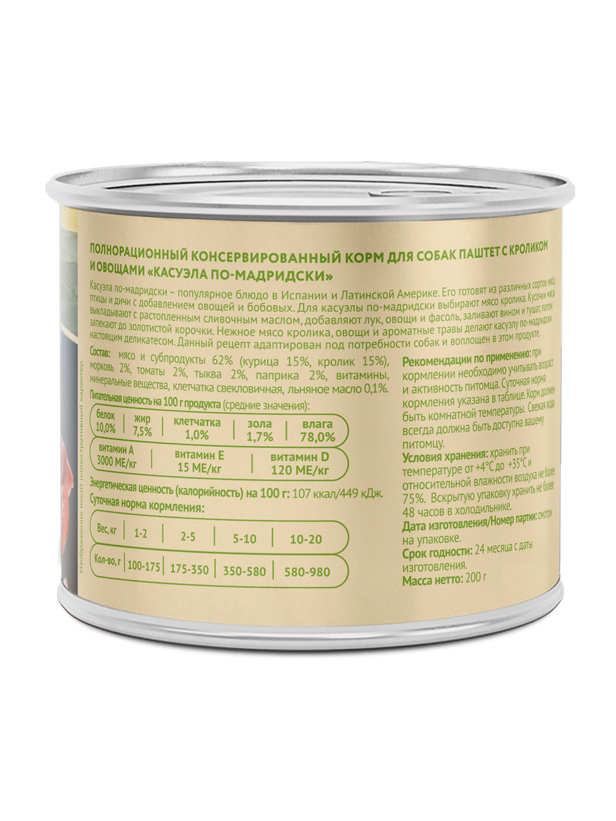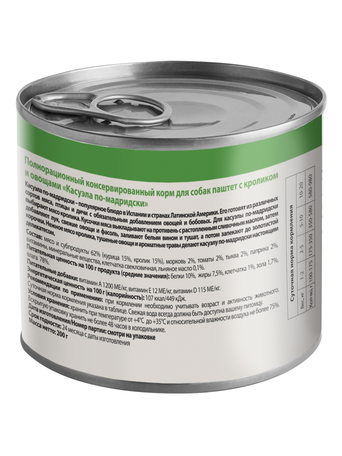 Полнорационный консервированный корм для собак "Касуэла по-мадридски". Паштет с кроликом и овощами.