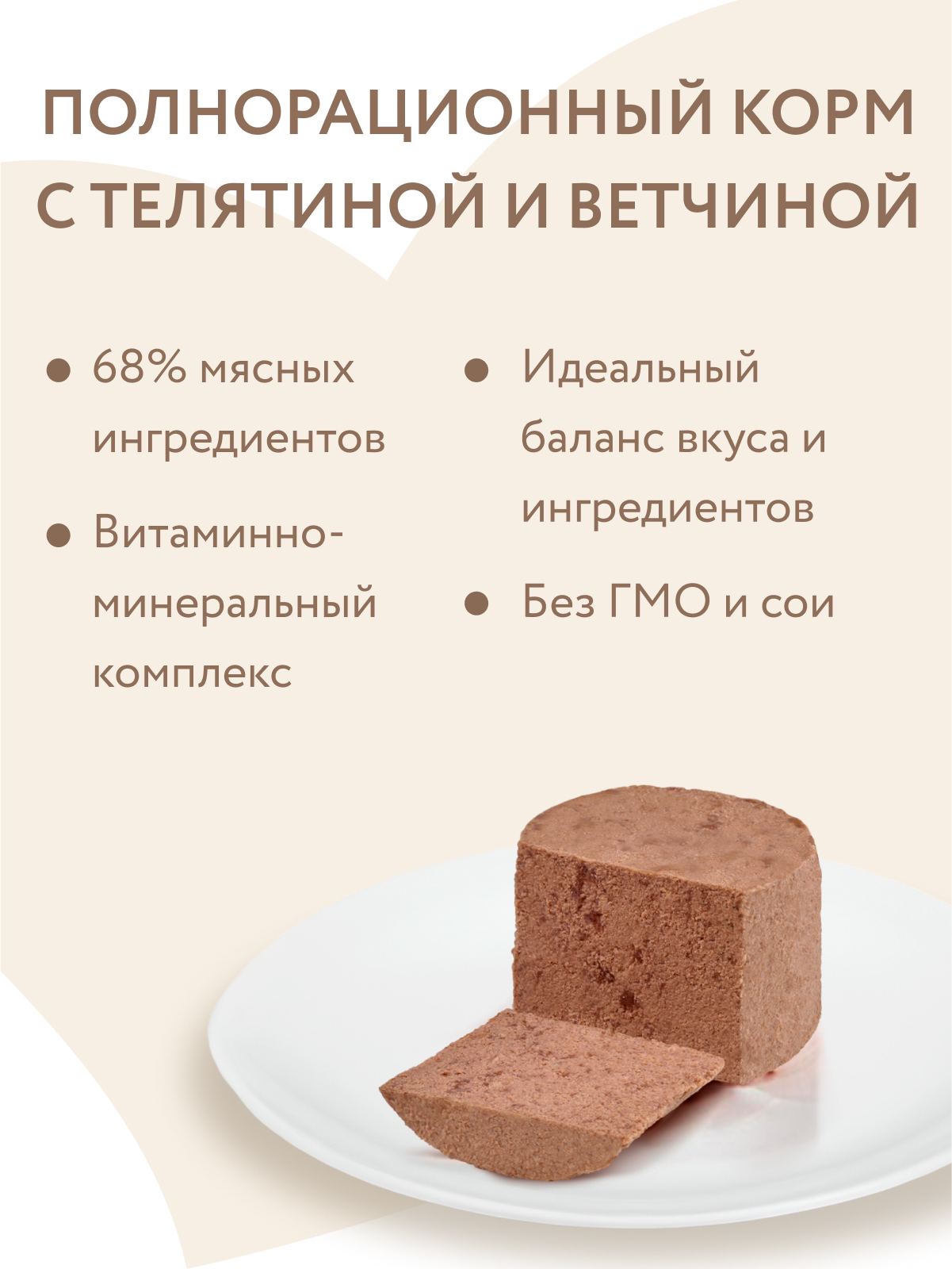 Состав: телятина 58%, ветчина свиная 10%, витамины, минеральные вещества, клетчатка свекловичная, льняное масло 0,1%.