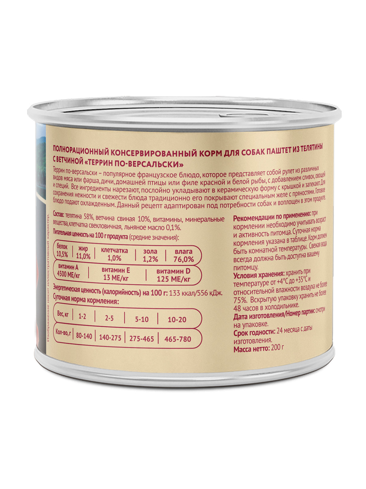 Полнорационный консервированный корм для собак "Террин по-версальски". Паштет из телятины с ветчиной.