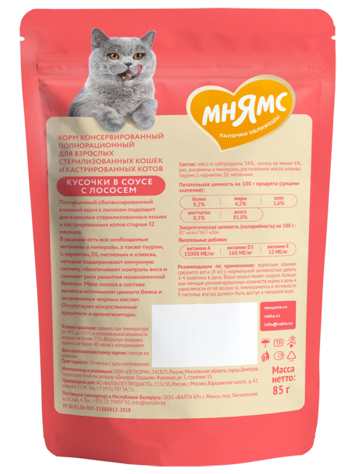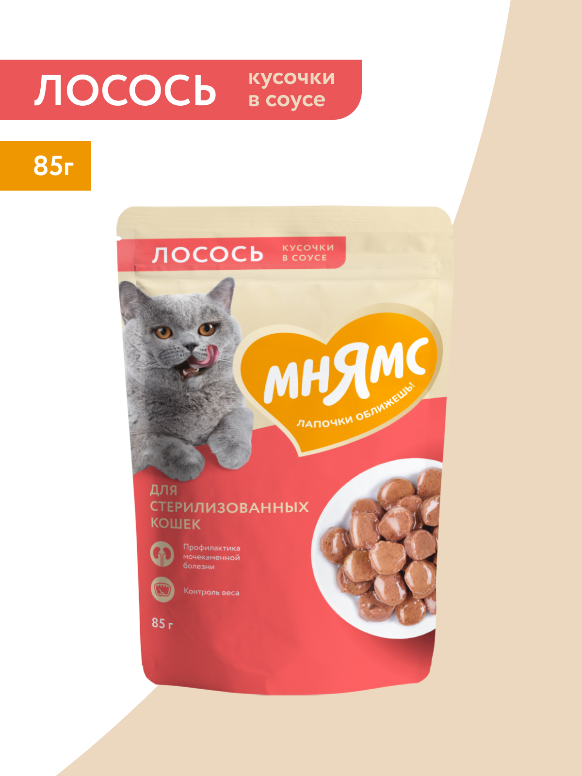 Высококачественный полнорационный сбалансированный влажный корм с лососем подходит для взрослых стерилизованных кошек и кастрированных котов старше 12 месяцев.