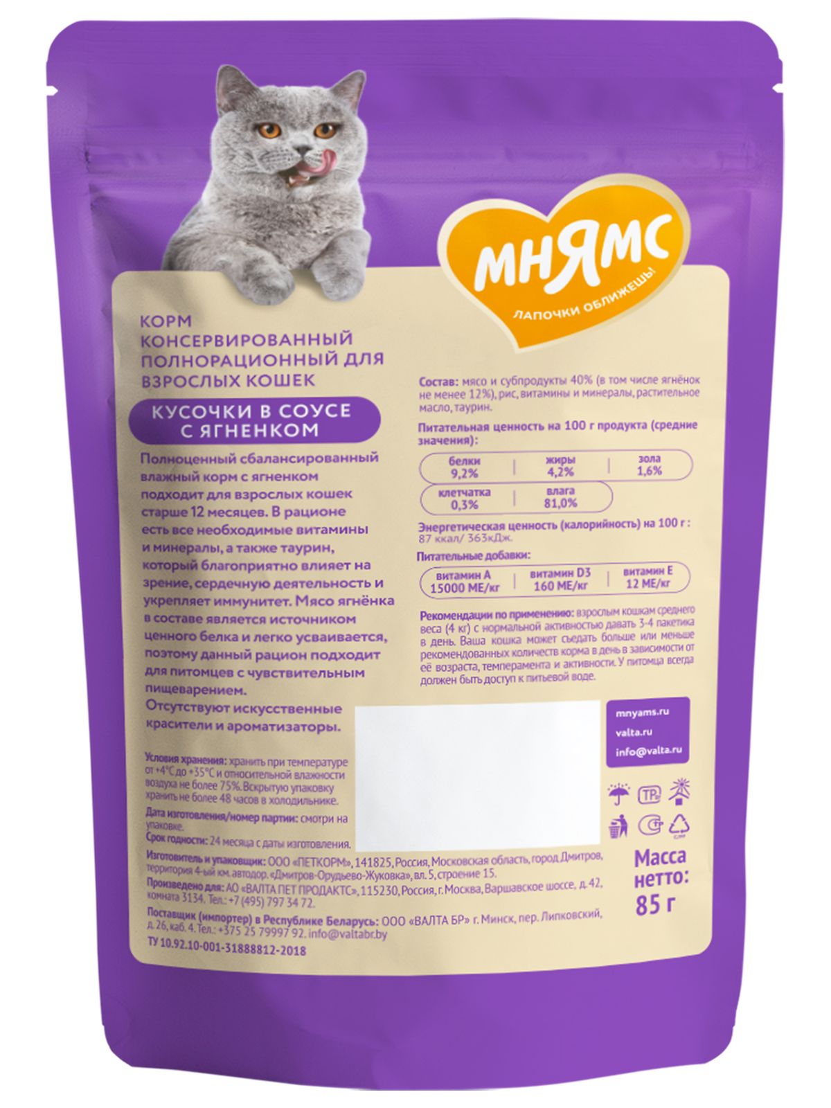Высококачественный полнорационный сбалансированный влажный корм с ягненком подходит для взрослых активных кошек старше 12 месяцев.