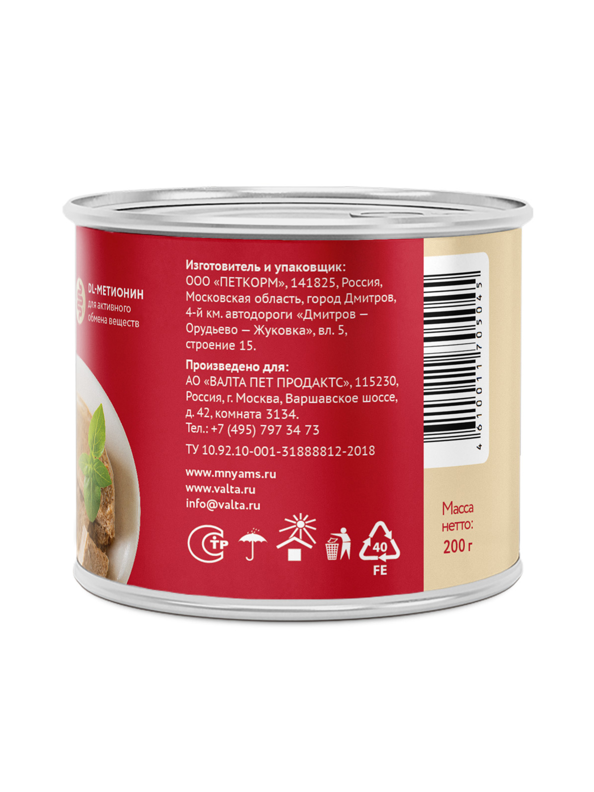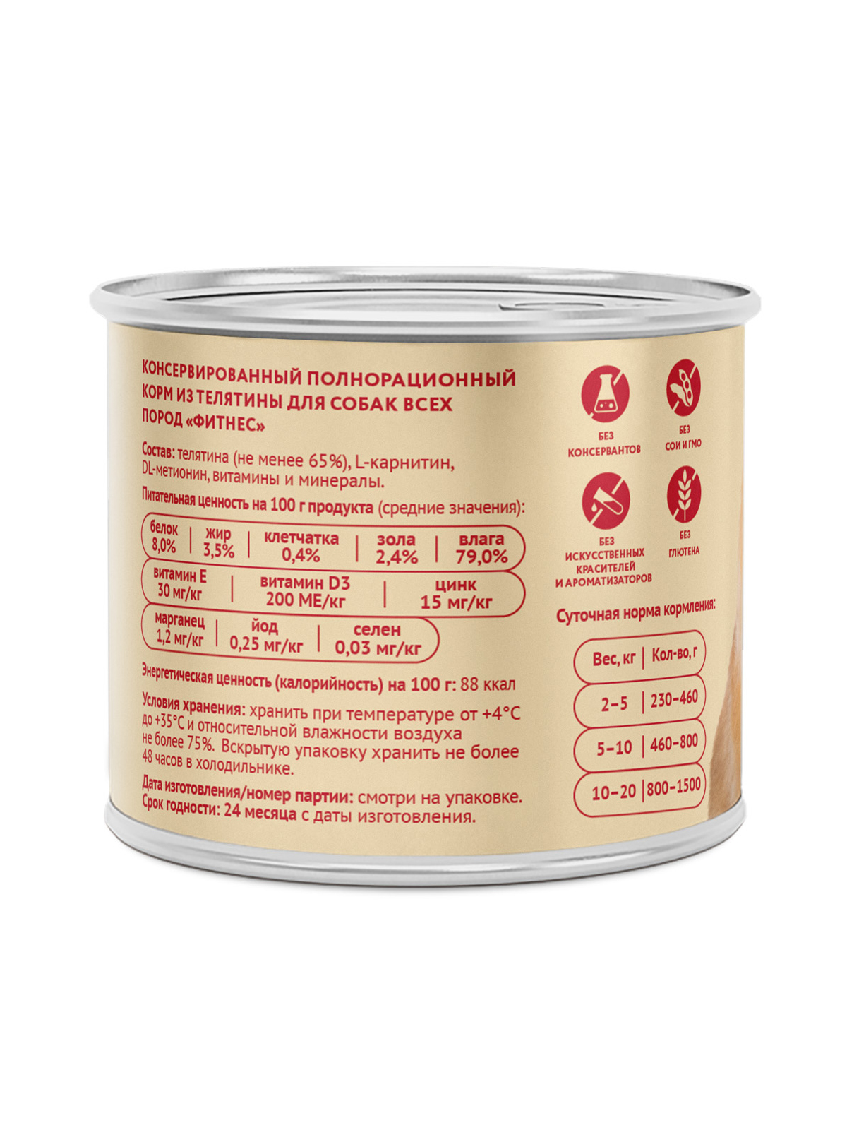 Состав: телятина (не менее 65%), L-карнитин, DL-метионин, витамины и минералы.