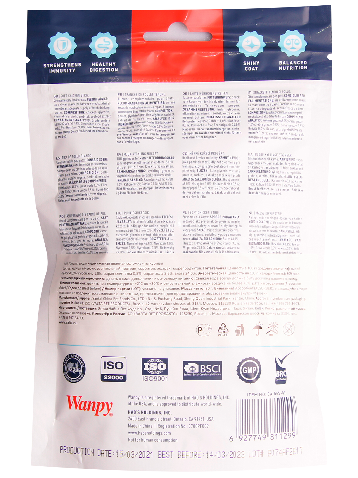 Состав: курица, глицерин, растительный протеин, сорбитол, экстракт морепродуктов.