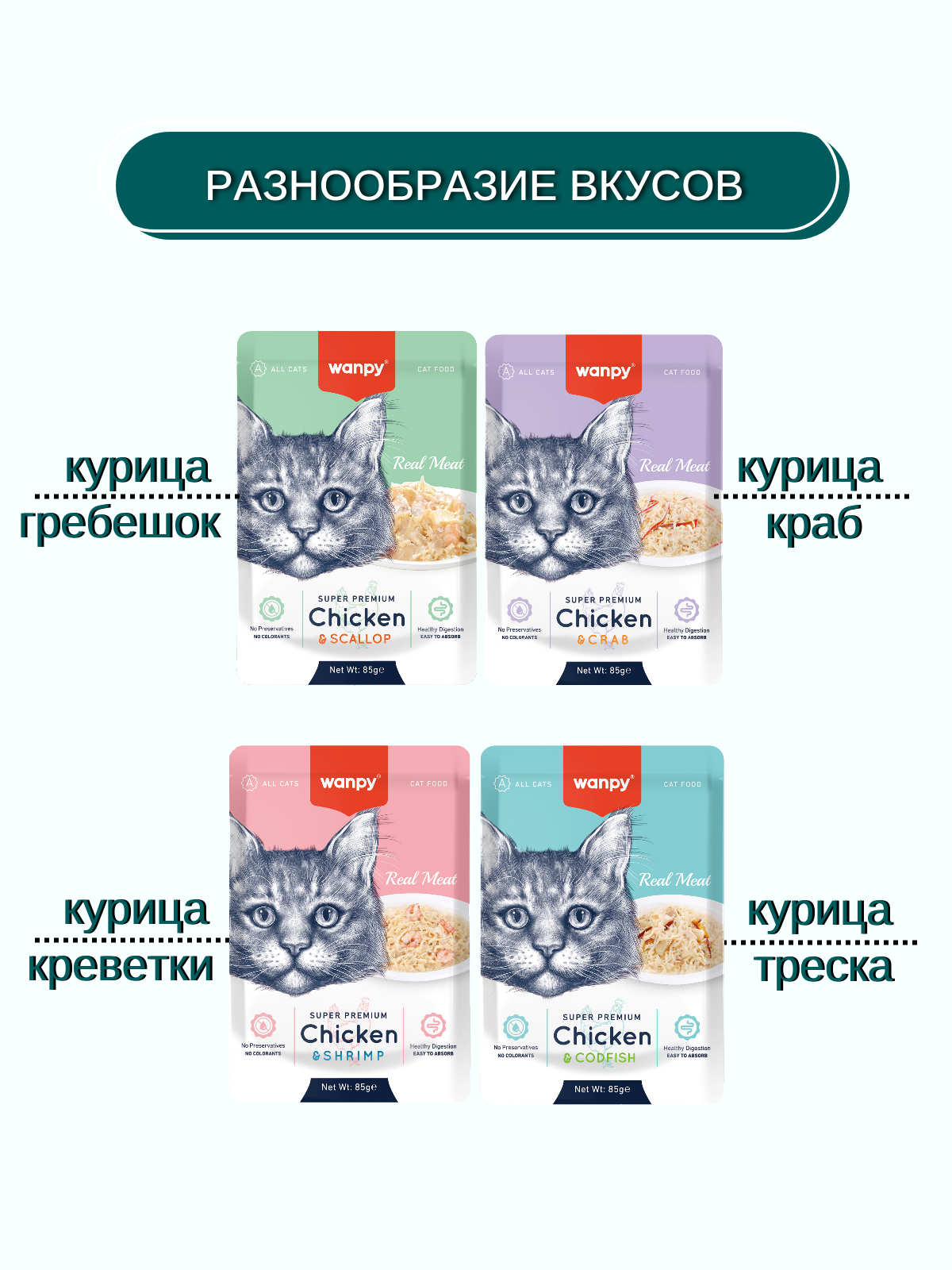 Wanpy Cat пауч для кошек с кусочками курицы и треской - это высококачественный сбалансированный корм, который обеспечит вашего питомца необходимыми витаминами и минералами.