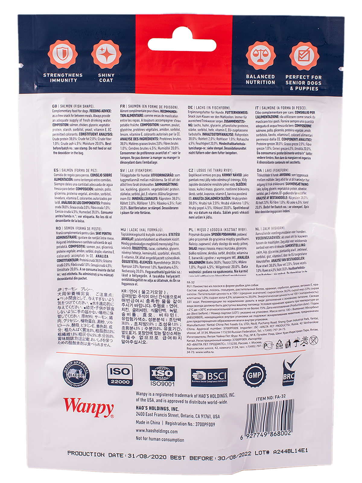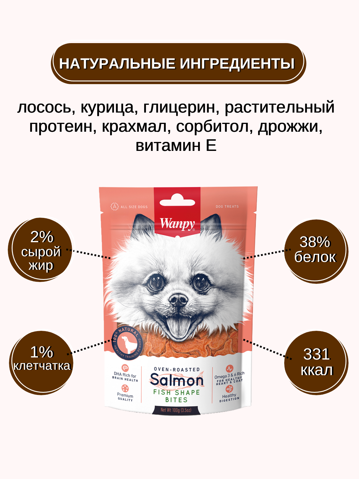 Wanpy Dog лакомство кусочки из нежного лосося в форме рыбок.